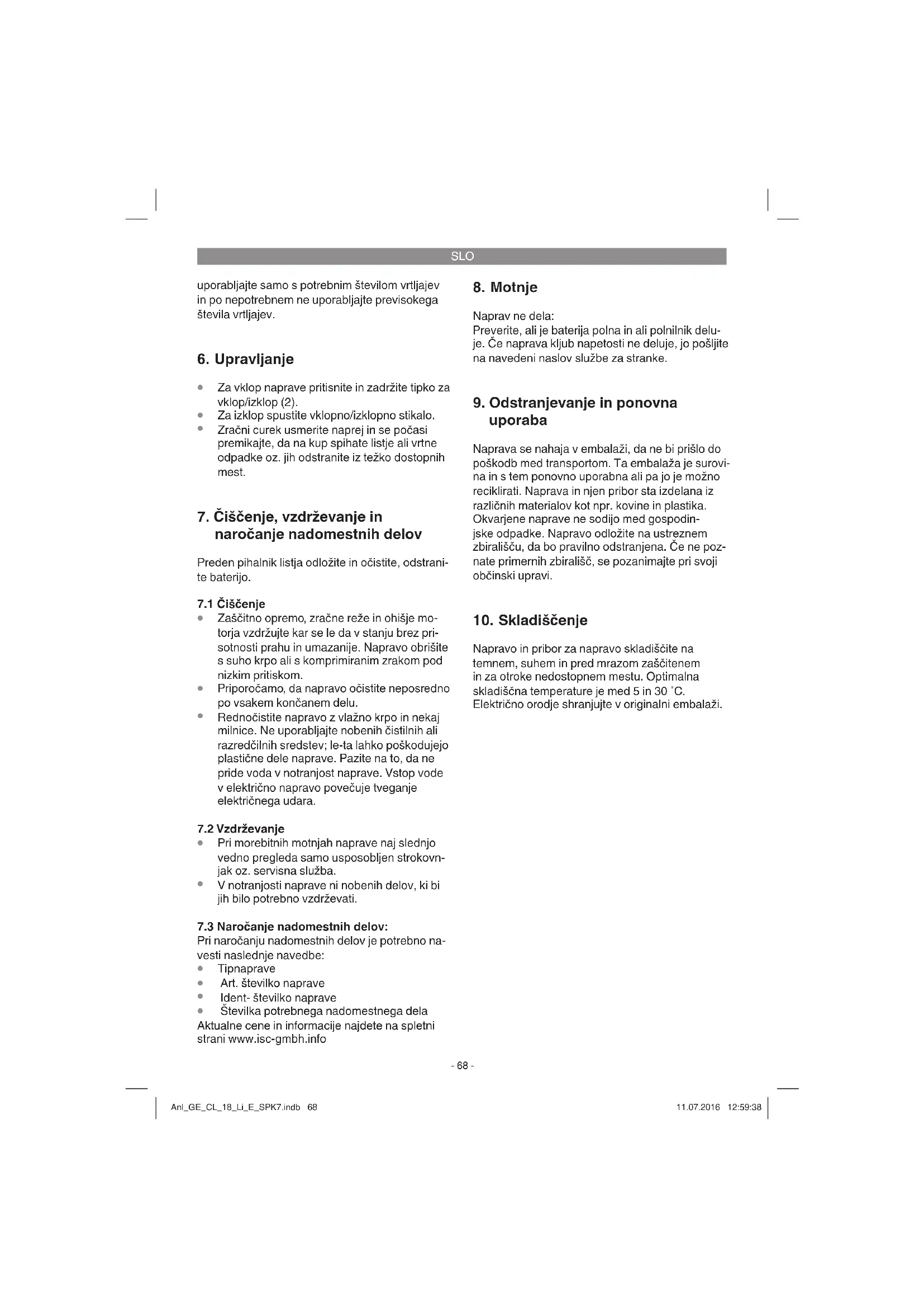 Napravo in pribor za napravo skladiščite na temnem, suhem in pred mrazom zaščitenem in za otroke nedostopnem mestu. Optimalna skladiščna temperature je med 5 in 30 ˚C. Električno orodje shranjujte v originalni embalaži. Anl_GE_CL_18_Li_E_SPK7.indb 68Anl_GE_CL_18_Li_E_SPK7.indb 68 11.07.2016 12:59:3811.07.2016 12:59:38SLO