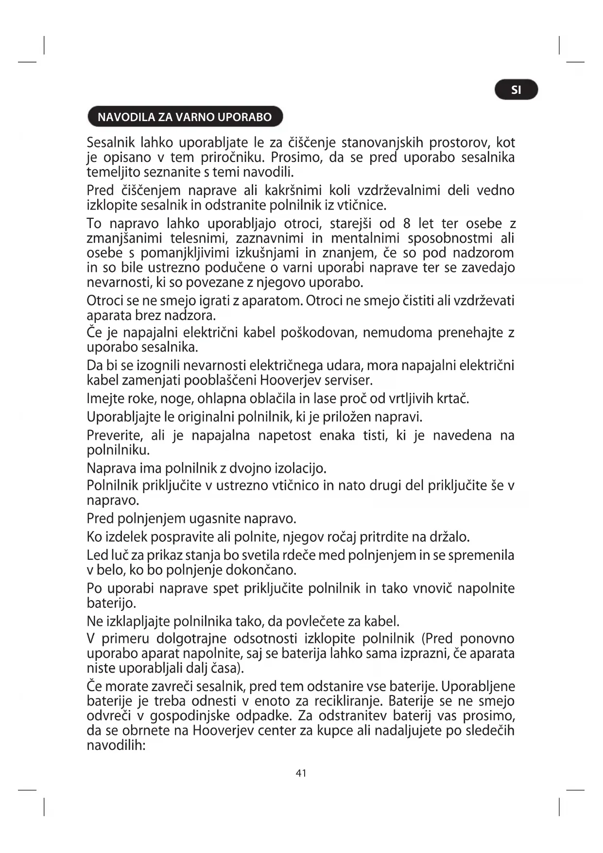 Sesalnik lahko uporabljate le za čiščenje stanovanjskih prostorov, kot je opisano v tem priročniku. Prosimo, da se pred uporabo sesalnika temeljito seznanite s temi navodili. Pred čiščenjem naprave ali kakršnimi koli vzdrževalnimi deli vedno izklopite sesalnik in odstranite polnilnik iz vtičnice. To napravo lahko uporabljajo otroci, starejši od 8 let ter osebe z zmanjšanimi telesnimi, zaznavnimi in mentalnimi sposobnostmi ali osebe s pomanjkljivimi izkušnjami in znanjem, če so pod nadzorom in so bile ustrezno podučene o varni uporabi naprave ter se zavedajo nevarnosti, ki so povezane z njegovo uporabo. Otroci se ne smejo igrati z aparatom. Otroci ne smejo čistiti ali vzdrževati aparata brez nadzora. Če je napajalni električni kabel poškodovan, nemudoma prenehajte z uporabo sesalnika. Da bi se izognili nevarnosti električnega udara, mora napajalni električni kabel zamenjati pooblaščeni Hooverjev serviser. Imejte roke, noge, ohlapna oblačila in lase proč od vrtljivih krtač. Uporabljajte le originalni polnilnik, ki je priložen napravi. Preverite, ali je napajalna napetost enaka tisti, ki je navedena na polnilniku. Naprava ima polnilnik z dvojno izolacijo. Polnilnik priključite v ustrezno vtičnico in nato drugi del priključite še v napravo. Pred polnjenjem ugasnite napravo. Ko izdelek pospravite ali polnite, njegov ročaj pritrdite na držalo. Led luč za prikaz stanja bo svetila rdeče med polnjenjem in se spremenila v belo, ko bo polnjenje dokončano. Po uporabi naprave spet priključite polnilnik in tako vnovič napolnite baterijo. Ne izklapljajte polnilnika tako, da povlečete za kabel. V primeru dolgotrajne odsotnosti izklopite polnilnik (Pred ponovno uporabo aparat napolnite, saj se baterija lahko sama izprazni, če aparata niste uporabljali dalj časa). Če morate zavreči sesalnik, pred tem odstanire vse baterije. Uporabljene baterije je treba odnesti v enoto za recikliranje. Baterije se ne smejo odvreči v gospodinjske odpadke. Za odstranitev baterij vas prosimo, da se obrnete na Hooverjev center za kupce ali nadaljujete po sledečih navodilih:42 OPOMBA: V primeru težav z razstavljanjem naprave ali za podrobnejše informacije o ravnanju z izdelkom, obnovi ali recikliranju izdelka se obrnite na krajevni urad ali komunalno podjetje za odvoz gospodinjskih odpadkov. POMEMBNO: Baterije pred odstranjevanjem vedno popolnoma izpraznite, polnilnik pa mora biti izključen iz omrežja. Odstranitev baterije po izteku življenjske dobe Baterije odvrzite na varen način.
