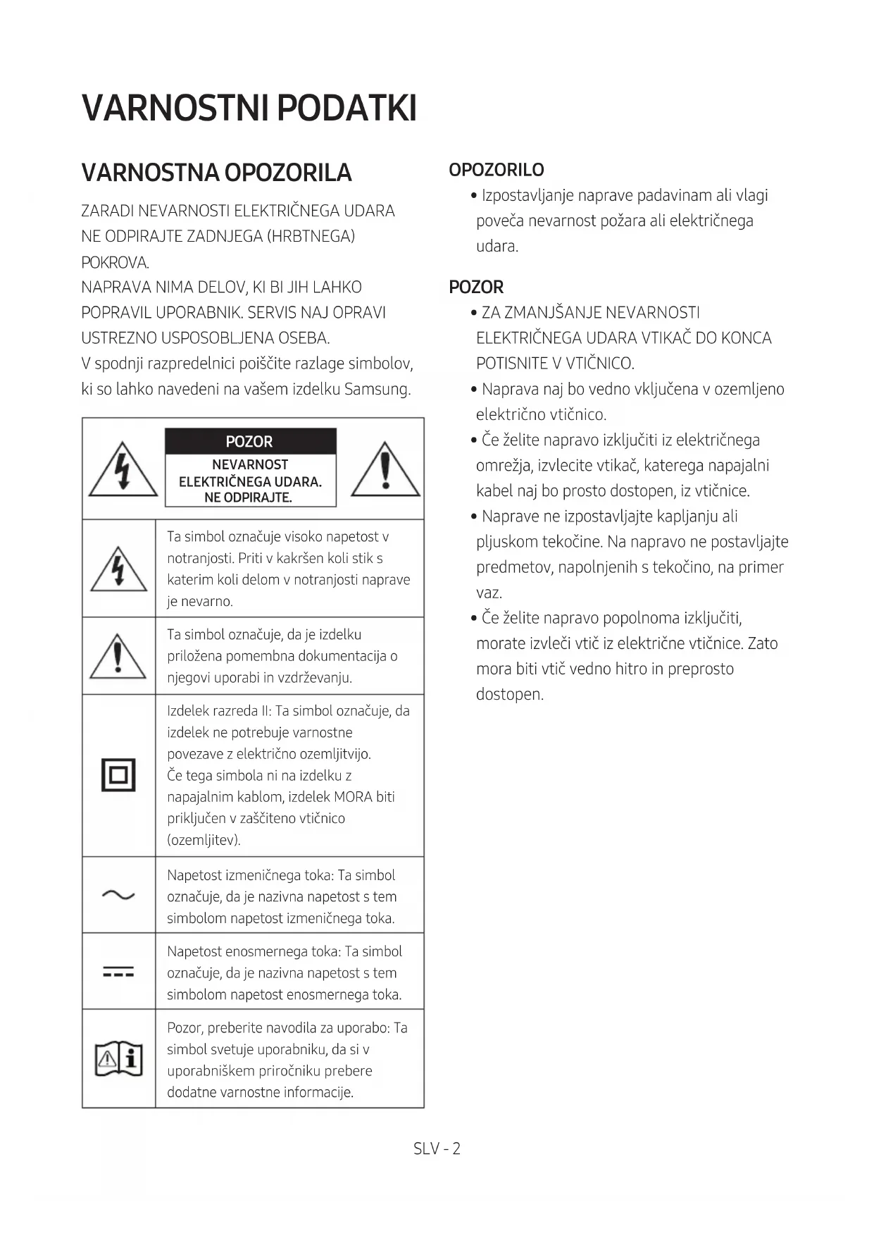 USTREZNO USPOSOBLJENA OSEBA. V spodnji razpredelnici poiščite razlage simbolov, ki so lahko navedeni na vašem izdelku Samsung. POZOR NEVARNOST ELEKTRIČNEGA UDARA. NE ODPIRAJTE.Ta simbol označuje visoko napetost v notranjosti. Priti v kakršen koli stik s katerim koli delom v notranjosti naprave je nevarno.Ta simbol označuje, da je izdelku priložena pomembna dokumentacija o njegovi uporabi in vzdrževanju.Izdelek razreda II: Ta simbol označuje, da izdelek ne potrebuje varnostne povezave z električno ozemljitvijo. Če tega simbola ni na izdelku z napajalnim kablom, izdelek MORA biti priključen v zaščiteno vtičnico (ozemljitev). Napetost izmeničnega toka: Ta simbol označuje, da je nazivna napetost s tem simbolom napetost izmeničnega toka.Napetost enosmernega toka: Ta simbol označuje, da je nazivna napetost s tem simbolom napetost enosmernega toka.Pozor, preberite navodila za uporabo: Ta simbol svetuje uporabniku, da si v uporabniškem priročniku prebere dodatne varnostne informacije. OPOZORILO