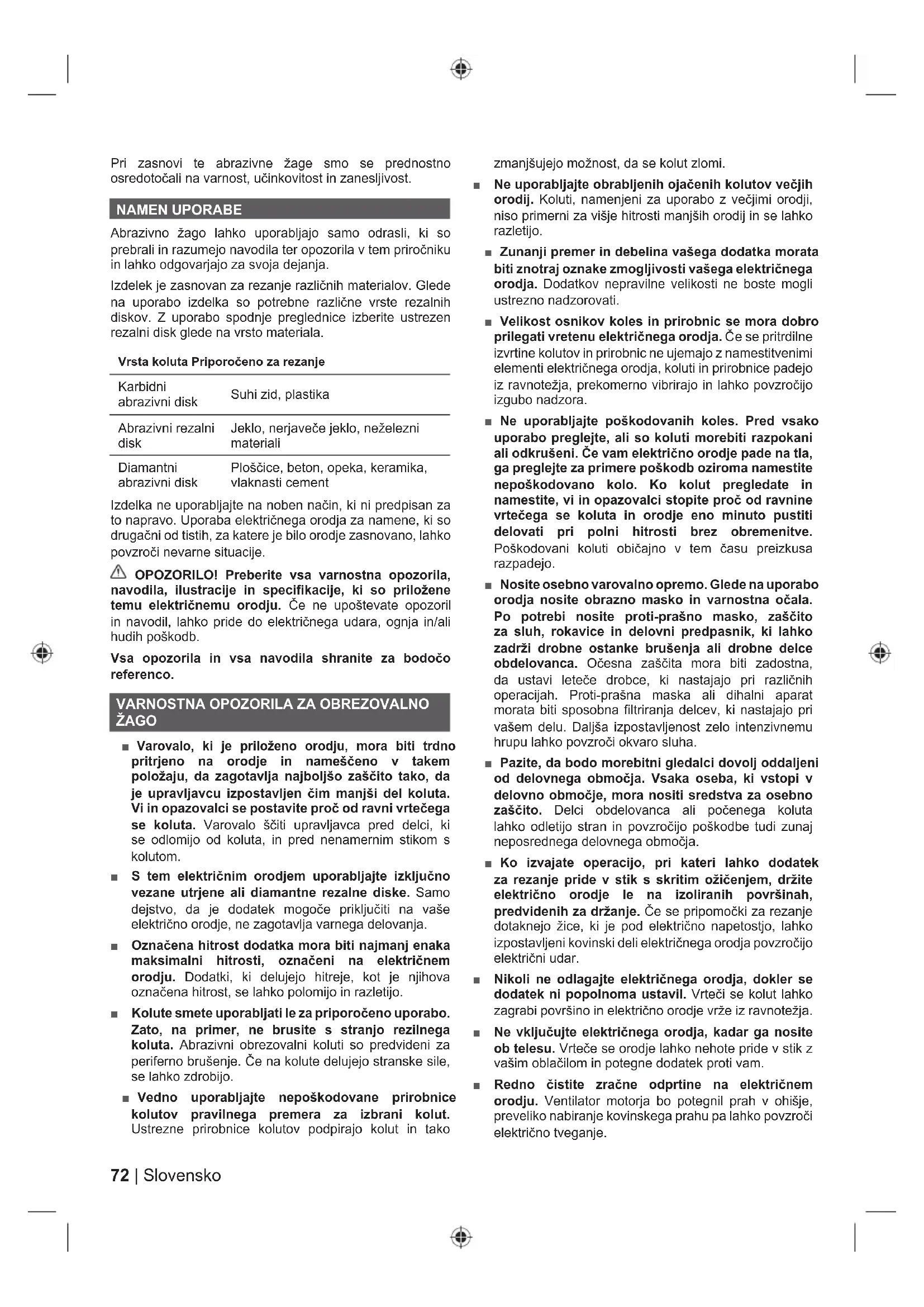 Napomena Dijelovi ili pribor prodan odvojeno72 | Slovensko Pri zasnovi te abrazivne žage smo se prednostno osredotočali na varnost, učinkovitost in zanesljivost. NAMEN UPORABE Abrazivno žago lahko uporabljajo samo odrasli, ki so prebrali in razumejo navodila ter opozorila v tem priročniku in lahko odgovarjajo za svoja dejanja. Izdelek je zasnovan za rezanje različnih materialov. Glede na uporabo izdelka so potrebne različne vrste rezalnih diskov. Z uporabo spodnje preglednice izberite ustrezen rezalni disk glede na vrsto materiala. Vrsta koluta Priporočeno za rezanje Karbidni abrazivni disk Suhi zid, plastika Abrazivni rezalni disk Jeklo, nerjaveče jeklo, neželezni materiali Diamantni abrazivni disk Ploščice, beton, opeka, keramika, vlaknasti cement Izdelka ne uporabljajte na noben način, ki ni predpisan za to napravo. Uporaba električnega orodja za namene, ki so drugačni od tistih, za katere je bilo orodje zasnovano, lahko povzroči nevarne situacije. OPOZORILO! Preberite vsa varnostna opozorila, navodila, ilustracije in specifikacije, ki so priložene temu električnemu orodju. Če ne upoštevate opozoril in navodil, lahko pride do električnega udara, ognja in/ali hudih poškodb. Vsa opozorila in vsa navodila shranite za bodočo referenco.