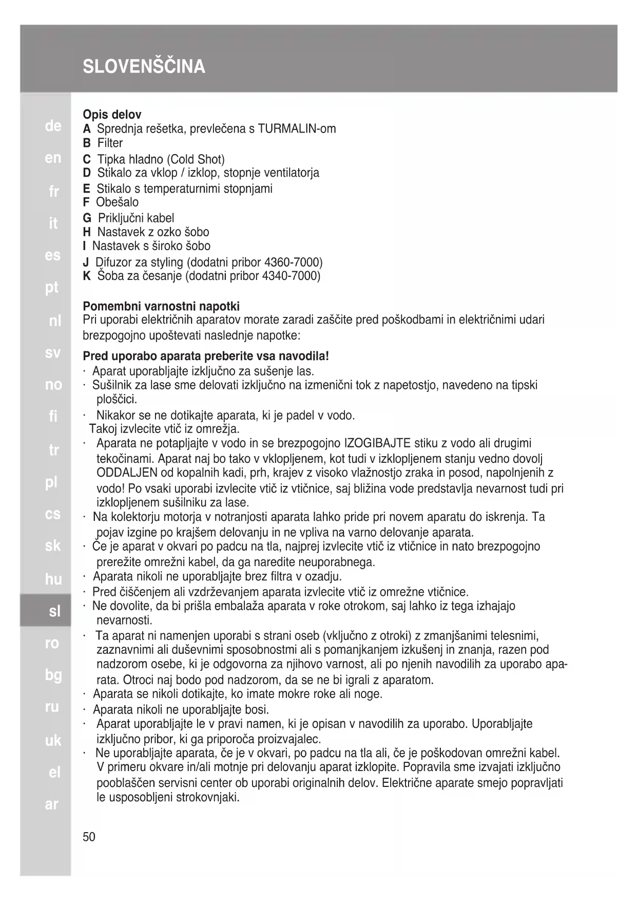 Opis delov A Sprednja rešetka, prevlečena s TURMALIN-om B Filter C Tipka hladno (Cold Shot) D Stikalo za vklop / izklop, stopnje ventilatorja E Stikalo s temperaturnimi stopnjami F Obešalo G Priključni kabel H Nastavek z ozko šobo I Nastavek s široko šobo J Difuzor za styling (dodatni pribor 4360-7000) K Šoba za česanje (dodatni pribor 4340-7000) Pomembni varnostni napotki Pri uporabi električnih aparatov morate zaradi zaščite pred poškodbami in električnimi udari brezpogojno upoštevati naslednje napotke: Pred uporabo aparata preberite vsa navodila!