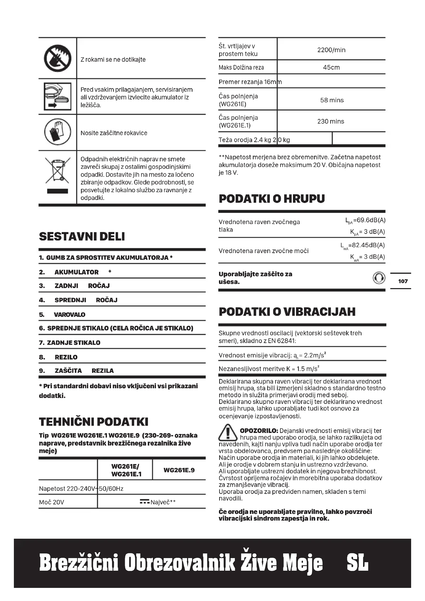 Tip WG261E WG261E.1 WG261E.9 (230-269- oznaka naprave, predstavnik brezžičnega rezalnika žive meje) WG261E/ WG261E.1 WG261E.9 Napetost 220-240V~50/60Hz Moč 20V Največ** Št. vrtljajev v prostem teku 2200/min Maks Dolžina reza 45cm Premer rezanja 16mm Čas polnjenja (WG261E) 58 mins Čas polnjenja (WG261E.1) 230 mins Teža orodja 2.4 kg 2.0 kg **Napetost merjena brez obremenitve. Začetna napetost akumulatorja doseže maksimum 20 V. Običajna napetost je 18 V.