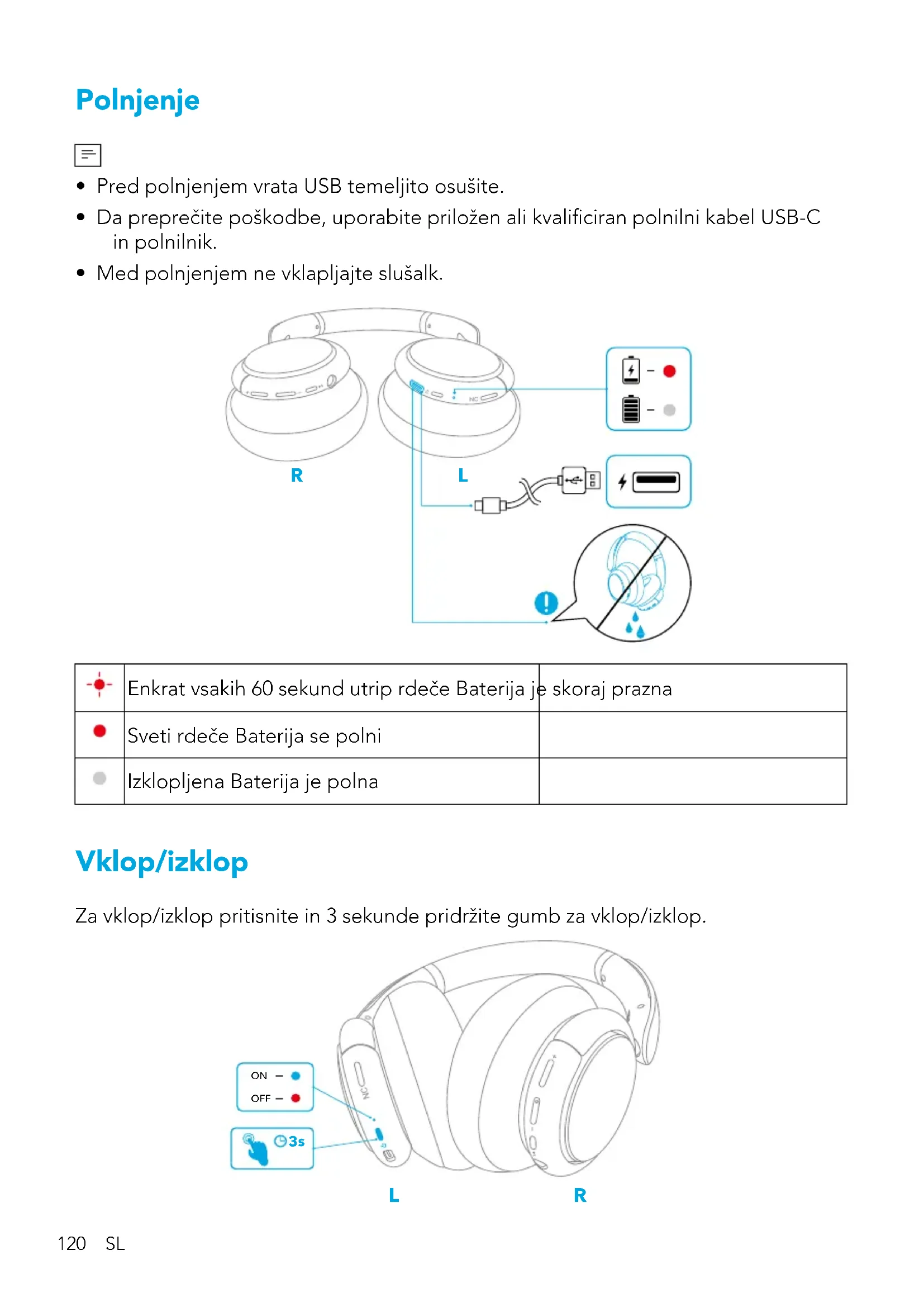 - Med polnjenjem ne vklapljajte slušalk. R L Enkrat vsakih 60 sekund utrip rdeče Baterija je skoraj prazna Sveti rdeče Baterija se polni Izklopljena Baterija je polna Vklop/izklop Za vklop/izklop pritisnite in 3 sekunde pridržite gumb za vklop/izklop.
