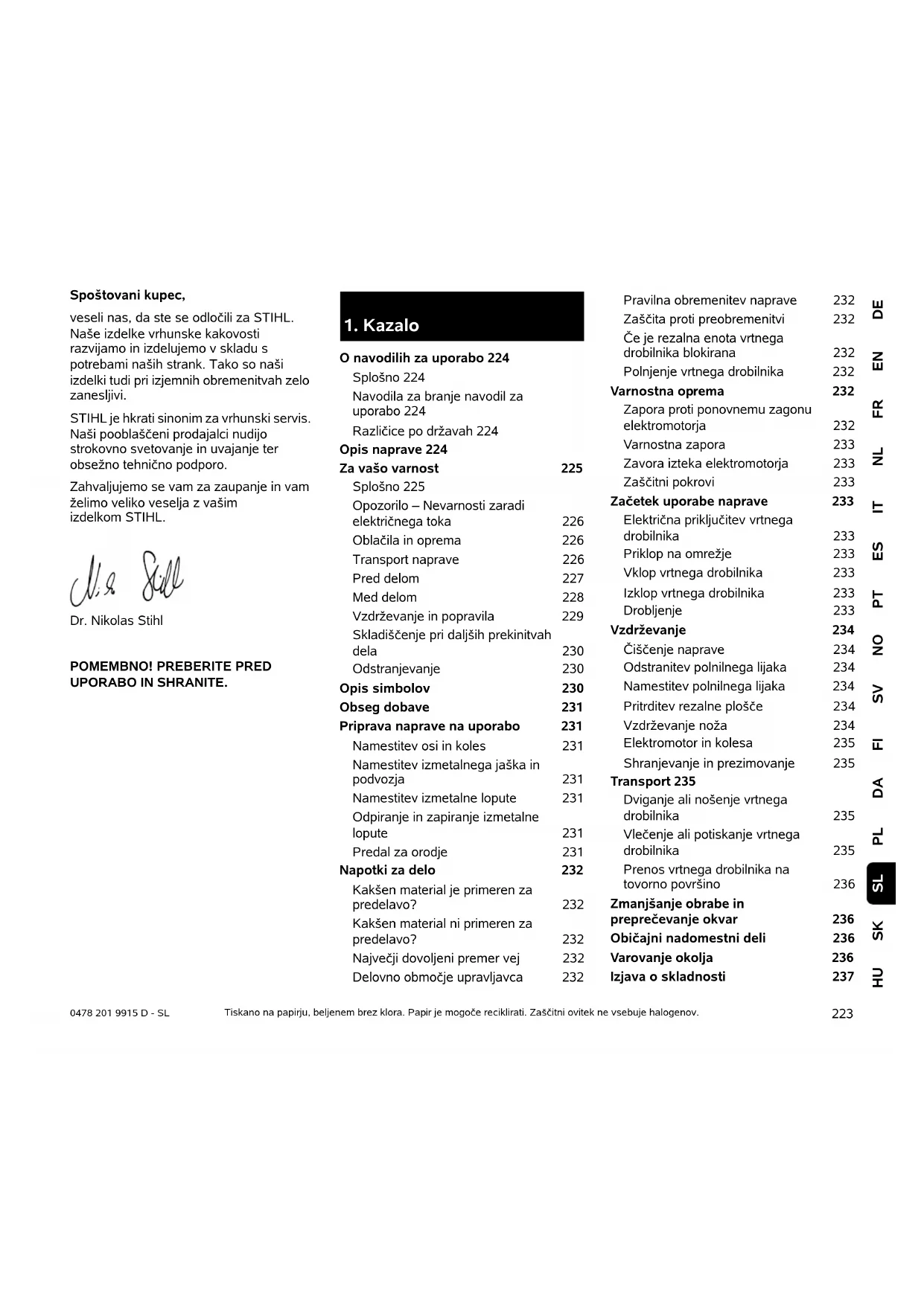 DEENFRNLITESPTNOSVFIDAPLSKHU SL 0478 201 9915 D - SL Spoštovani kupec, veseli nas, da ste se odločili za STIHL. Naše izdelke vrhunske kakovosti razvijamo in izdelujemo v skladu s potrebami naših strank. Tako so naši izdelki tudi pri izjemnih obremenitvah zelo zanesljivi. STIHL je hkrati sinonim za vrhunski servis. Naši pooblaščeni prodajalci nudijo strokovno svetovanje in uvajanje ter obsežno tehnično podporo. Zahvaljujemo se vam za zaupanje in vam želimo veliko veselja z vašim izdelkom STIHL. Dr. Nikolas Stihl
