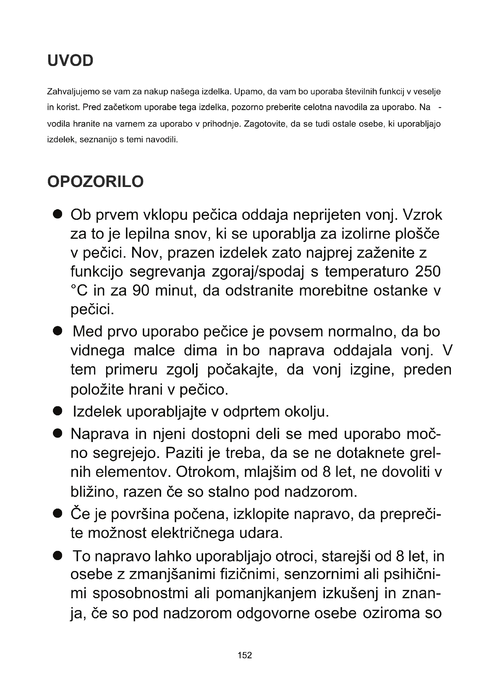 Ob prvem vklopu pečica oddaja neprijeten vonj. Vzrok za to je lepilna snov, ki se uporablja za izolirne plošče v pečici. Nov, prazen izdelek zato najprej zaženite z funkcijo segrevanja zgoraj/spodaj s temperaturo 250 °C in za 90 minut, da odstranite morebitne ostanke v pečici. Med prvo uporabo pečice je povsem normalno, da bo vidnega malce dima in bo naprava oddajala vonj. V tem primeru zgolj počakajte, da vonj izgine, preden položite hrani v pečico. Izdelek uporabljajte v odprtem okolju. Naprava in njeni dostopni deli se med uporabo moč- no segrejejo. Paziti je treba, da se ne dotaknete grel- nih elementov. Otrokom, mlajšim od 8 let, ne dovoliti v bližino, razen če so stalno pod nadzorom. Če je površina počena, izklopite napravo, da prepreči- te možnost električnega udara. To napravo lahko uporabljajo otroci, starejši od 8 let, in osebe z zmanjšanimi zičnimi, senzornimi ali psihični- mi sposobnostmi ali pomanjkanjem izkušenj in znan- ja, če so pod nadzorom odgovorne osebe oziroma so 152bili poučeni o pravilni uporabi naprave ter povezanimi nevarnostmi z njeno uporabo. Otroci se z napravo ne smejo igrati. Otroci brez nadzora naprave ne smejo čistiti in izvajati vzdrževalnih del. Med uporabo se naprava močno segreje. Paziti je tre- ba, da se ne dotaknete grelnih elementov v pečici. Ne dovolite otrokom v bližino pečice, ko je ta vključe- na, predvsem med uporabo funkcije žara.