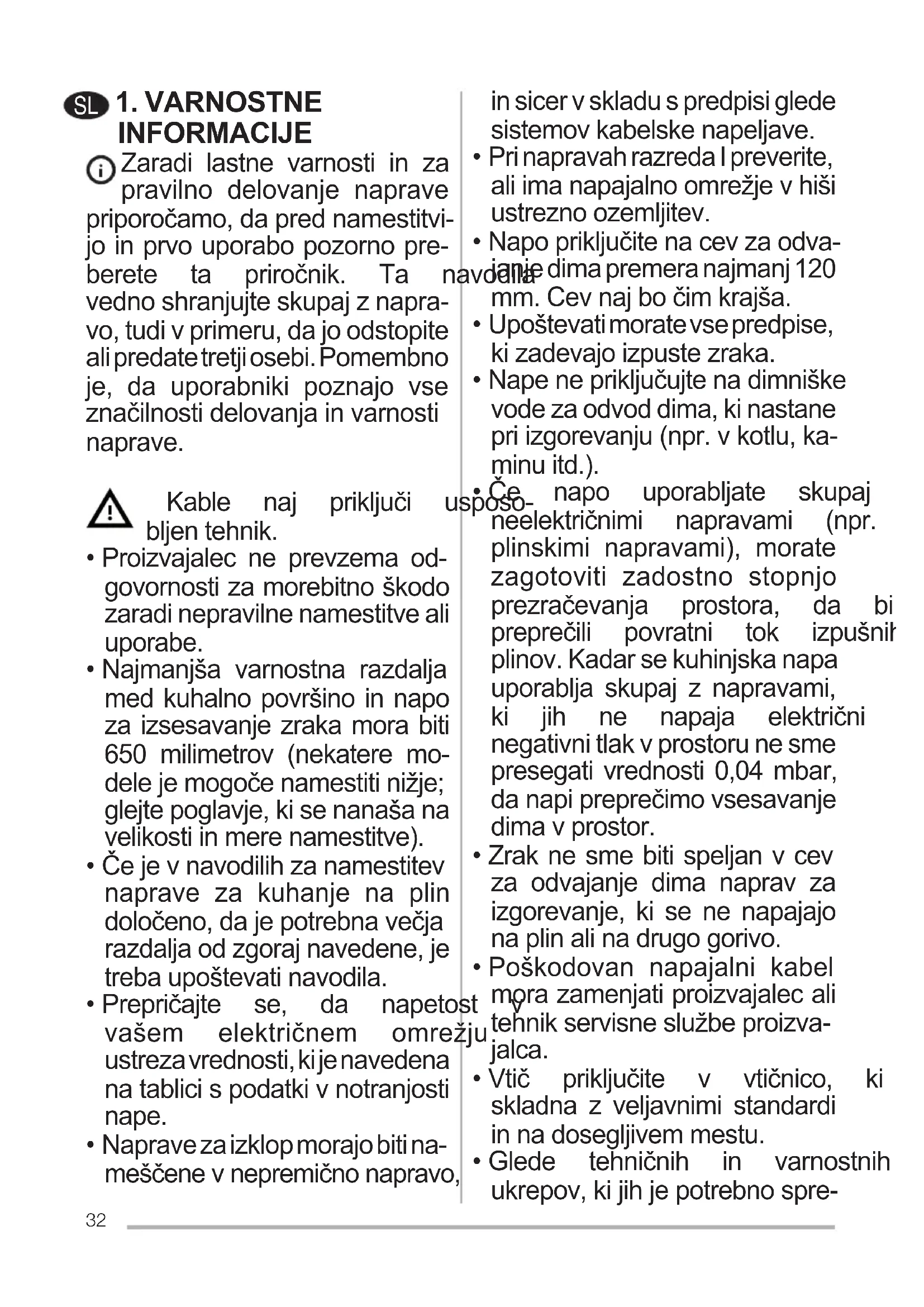 INFORMACIJE Zaradi lastne varnosti in za pravilno delovanje naprave priporočamo,daprednamestitvi- jo in prvo uporabo pozorno pre- berete ta priročnik. Ta navodila vedno shranjujte skupaj z napra- vo, tudi v primeru, da jo odstopite ali predate tretji osebi. Pomembno je, da uporabniki poznajo vse značilnostidelovanjainvarnosti naprave. Kable naj priključi usposo- bljen tehnik.