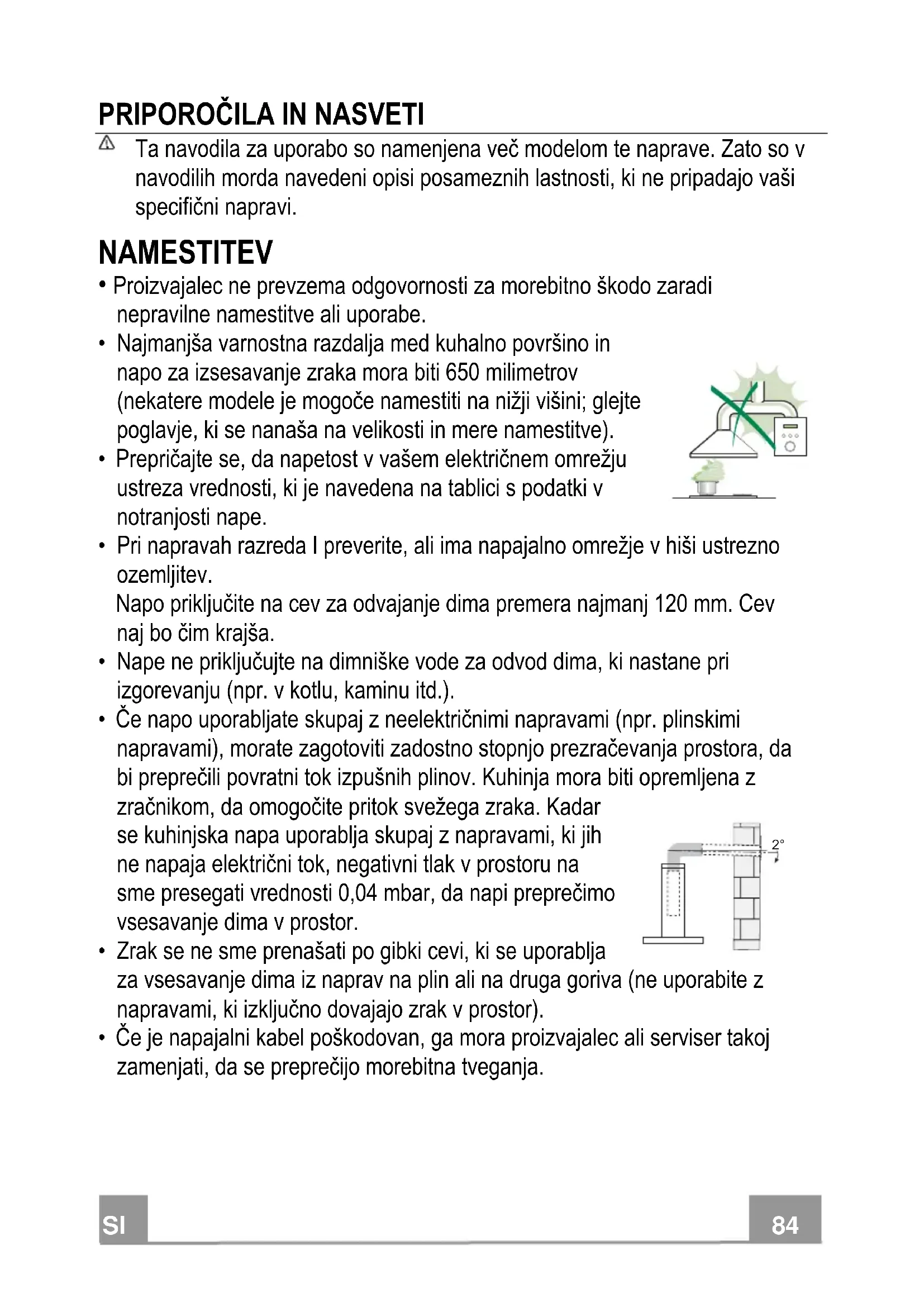- Če napo uporabljate skupaj z neelektričnimi napravami (npr. plinskimi napravami), morate zagotoviti zadostno stopnjo prezračevanja prostora, da bi preprečili povratni tok izpušnih plinov. Kuhinja mora biti opremljena z zračnikom, da omogočite pritok svežega zraka. Kadar se kuhinjska napa uporablja skupaj z napravami, ki jih ne napaja električni tok, negativni tlak v prostoru na sme presegati vrednosti 0,04 mbar, da napi preprečimo vsesavanje dima v prostor.