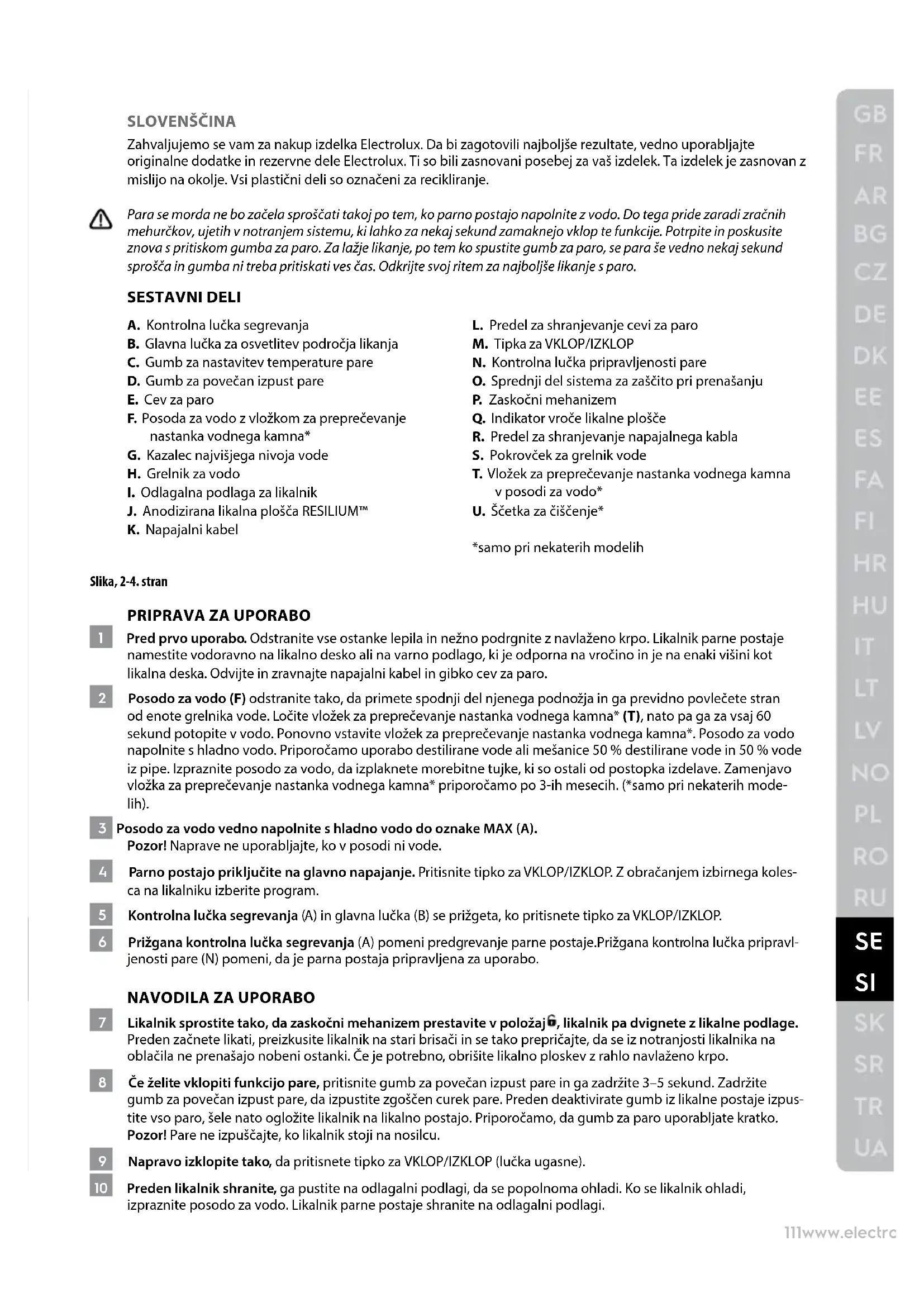 7 Likalnik sprostite tako, da zaskočni mehanizem prestavite v položaj , likalnik pa dvignete z likalne podlage. Preden začnete likati, preizkusite likalnik na stari brisači in se tako prepričajte, da se iz notranjosti likalnika na oblačila ne prenašajo nobeni ostanki. Če je potrebno, obrišite likalno ploskev z rahlo navlaženo krpo. 8 Če želite vklopiti funkcijo pare, pritisnite gumb za povečan izpust pare in ga zadržite 3–5 sekund. Zadržite gumb za povečan izpust pare, da izpustite zgoščen curek pare. Preden deaktivirate gumb iz likalne postaje izpus- tite vso paro, šele nato ogložite likalnik na likalno postajo. Priporočamo, da gumb za paro uporabljate kratko. Pozor! Pare ne izpuščajte, ko likalnik stoji na nosilcu. 9 Napravo izklopite tako, da pritisnete tipko za VKLOP/IZKLOP (lučka ugasne). 10 Preden likalnik shranite, ga pustite na odlagalni podlagi, da se popolnoma ohladi. Ko se likalnik ohladi, izpraznite posodo za vodo. Likalnik parne postaje shranite na odlagalni podlagi.112 www.electrolux.com 11 Ko naprave več ne uporabljate, jo izklopite s pritiskom na tipko za VKLOP/IZKLOP. Likalnik položite na odlagalno podlago, zaskočni mehanizem pa prestavite v položaj , da preprečite premikanje likalnika. 12 Napajalni kabel vedno shranite v predel za shranjevanje napajalnega kabla (R), gibko cev za paro pa v shran- jevalni del za cev za paro (L) na podstavku parne postaje. Opozorilo! NIKOLI ne ovijajte napajalnega kabla okrog likalnika. ČIŠČENJE 13 Podstavek postaje obrnite na stran, tako da je pokrovček grelnika vode na vrhu. Odvijte pokrovček grelnika vode. Stran z napravo obrnite nad umivalnikom in popolnoma izpraznite grelnik vode. 14 Pripravite vsaj 300 ml mešanice sredstva.(Za mešanico uporabite priporočeno razmerje. Če nastaja veliko vodnega kamna, ustrezno povečajte delež sredstva za odstranjevanje vodnega kamna.) Opomba: priporočamo uporabo Electroluxovega sredstva za odstranjevanje vodnega kamna EUD5. Upoštev- ajte navodila glede razmerja vode in sredstva za odstranjevanje vodnega kamna, ki so navedena na plastenki. Priporočamo, da izdelek očistite vsaka 2 meseca. 15 Izlijte mešanico. Grelnik za vodo napolnite s čisto vodo in jo nato izlijte. Ta korak ponovite večkrat, dokler ne odstranite vsega vodnega kamna in ni več vonja po sredstvu za odstranjevanje vodnega kamna. Pred ponovno sestavo v grelnik za vodo vrnite merico čiste vode. GARANCIJA NE KRIJE POŠKODBE, NASTALE KOT POSLEDICA MAŠENJA ZARADI VODNEGA KAMNA. Po konča- nem čiščenju pustite v grelniku za vodo nekaj vode (preden ga znova zaprete). 16 Ščetko za čiščenje* vstavite v odprtino grelnika vode in očistite ostanke vode in vodnega kamna, pri čemer napravo držite nad umivalnikom. (*samo pri nekaterih modelih). 17 Napravo očistite z rahlo navlaženo krpo. Pri odstranjevanju trdovratnih madežev lahko nanesete malo nea- brazivnega čistilnega sredstva. Uživajte z vašim novim Electrolux izdelkom! VARNOSTNI NASVETI Pred prvo uporabo naprave pozorno preberite navodila za uporabo.