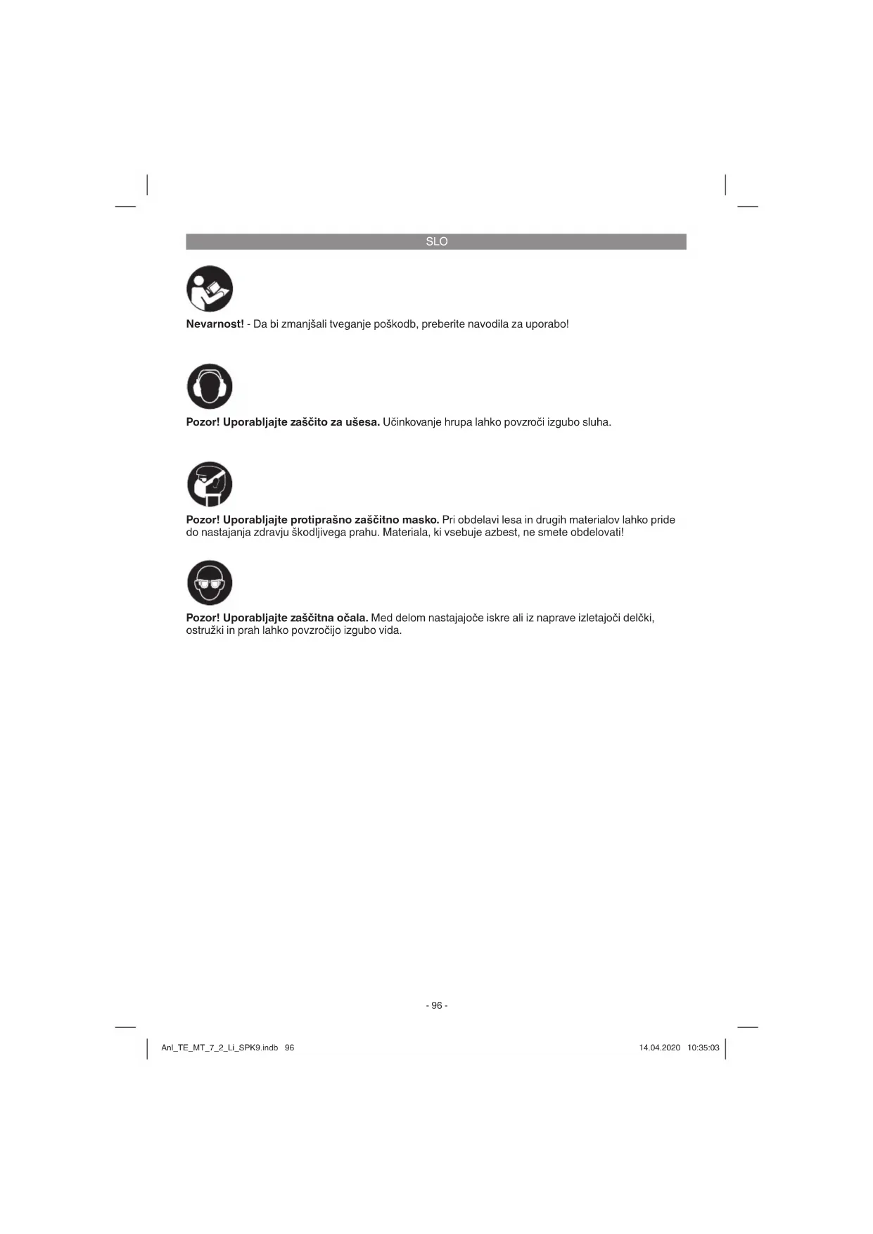 Nevarnost! - Da bi zmanjšali tveganje poškodb, preberite navodila za uporabo! Pozor! Uporabljajte zaščito za ušesa. Učinkovanje hrupa lahko povzroči izgubo sluha. Pozor! Uporabljajte zaščitna očala. Med delom nastajajoče iskre ali iz naprave izletajoči delčki, ostružki in prah lahko povzročijo izgubo vida. Pozor! Uporabljajte protiprašno zaščitno masko. Pri obdelavi lesa in drugih materialov lahko pride do nastajanja zdravju škodljivega prahu. Materiala, ki vsebuje azbest, ne smete obdelovati! Anl_TE_MT_7_2_Li_SPK9.indb 96Anl_TE_MT_7_2_Li_SPK9.indb 96 14.04.2020 10:35:0314.04.2020 10:35:03SLO