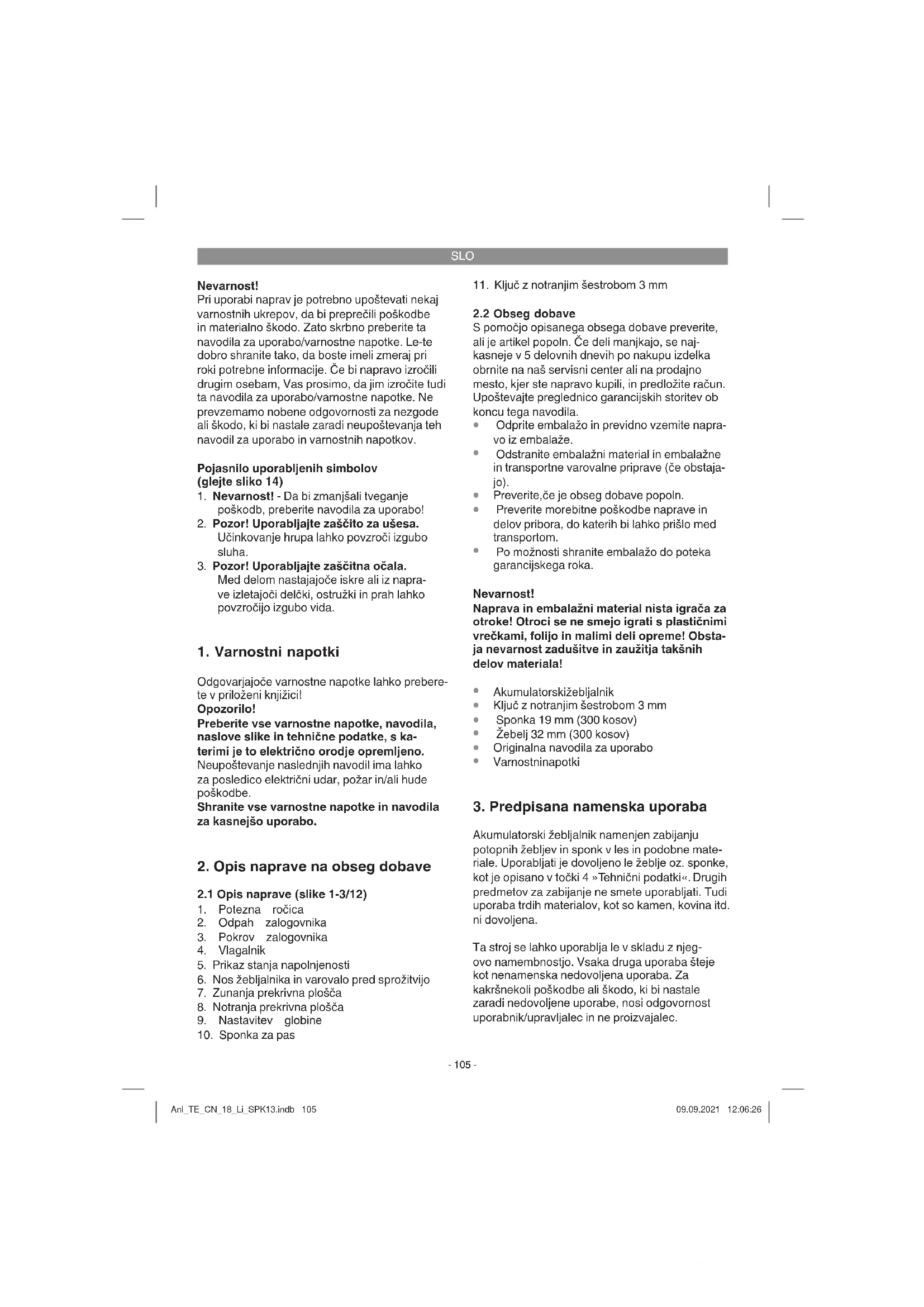 Opozorilo! Pred vsakim preverjanjem in nastavljanjem odstranite akumulator. Opozorilo: Pri delu z akumulatorskim žebljalnikom no- site potrebna zaščitna oblačila in še zlasti zaščitna očala. Upoštevajte varnostne določbe. Anl_TE_CN_18_Li_SPK13.indb 106Anl_TE_CN_18_Li_SPK13.indb 106 09.09.2021 12:06:2609.09.2021 12:06:26SLO