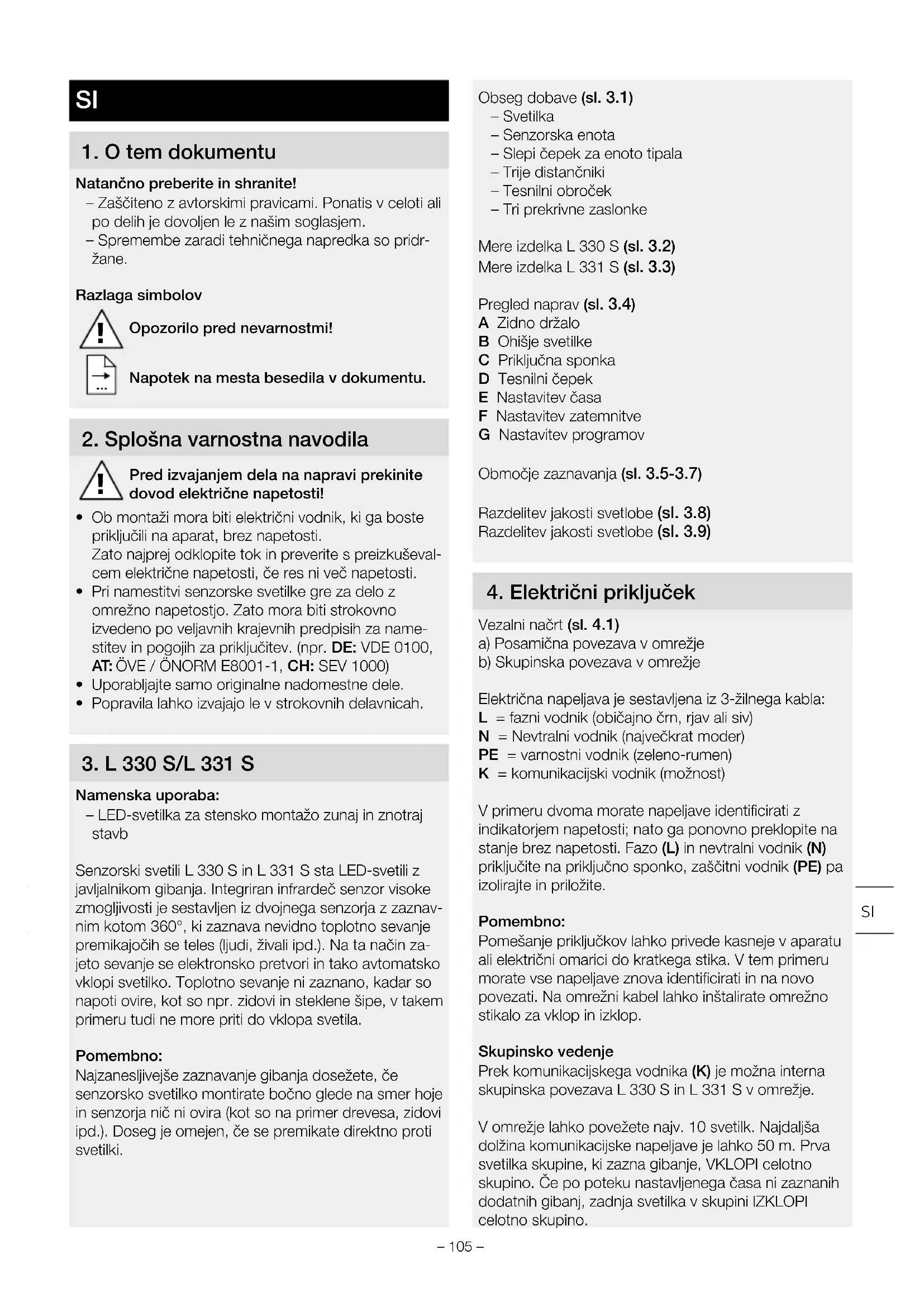 Namenska uporaba: – LED-svetilka za stensko montažo zunaj in znotraj stavb Senzorski svetili L330 S in L331 S sta LED-svetili z javljalnikom gibanja. Integriran infrardeč senzor visoke zmogljivosti je sestavljen iz dvojnega senzorja z zaznav- nim kotom 360°, ki zaznava nevidno toplotno sevanje premikajočih se teles (ljudi, živali ipd.). Na ta način za- jeto sevanje se elektronsko pretvori in tako avtomatsko vklopi svetilko. Toplotno sevanje ni zaznano, kadar so napoti ovire, kot so npr. zidovi in steklene šipe, v takem primeru tudi ne more priti do vklopa svetila. Pomembno: Najzanesljivejše zaznavanje gibanja dosežete, če senzorsko svetilko montirate bočno glede na smer hoje in senzorja nič ni ovira (kot so na primer drevesa, zidovi ipd.). Doseg je omejen, če se premikate direktno proti svetilki. Obseg dobave (sl.3.1) – Svetilka – Senzorska enota – Slepi čepek za enoto tipala – Trije distančniki – Tesnilni obroček – Tri prekrivne zaslonke Mere izdelka L330 S (sl.3.2) Mere izdelka L331 S (sl.3.3) Pregled naprav (sl.3.4) A Zidno držalo B Ohišje svetilke C Priključna sponka D Tesnilni čepek E Nastavitev časa F Nastavitev zatemnitve G Nastavitev programov Območje zaznavanja (sl.3.5-3.7) Razdelitev jakosti svetlobe (sl. 3.8) Razdelitev jakosti svetlobe (sl. 3.9)