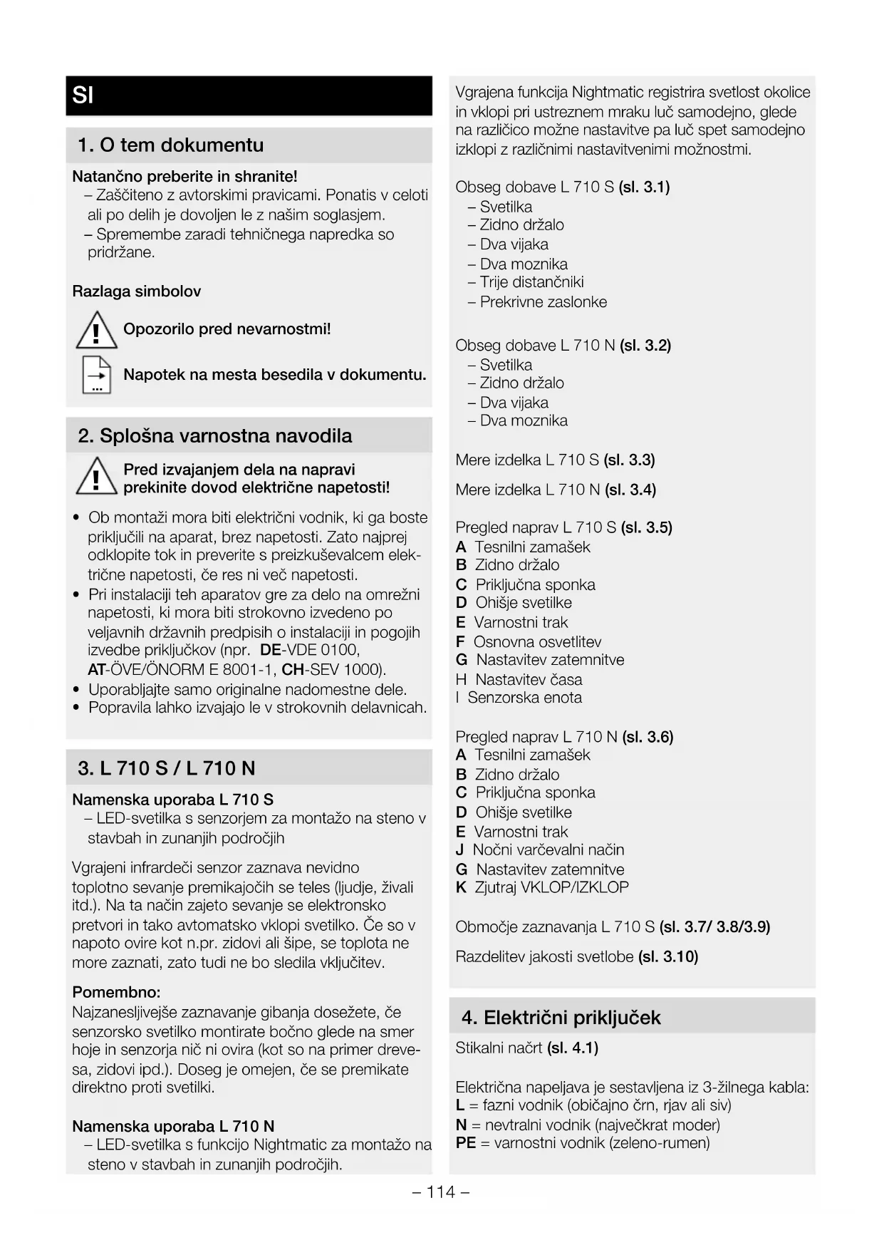 Namenska uporaba L 710 S – LED-svetilka s senzorjem za montažo na steno v stavbah in zunanjih področjih Vgrajeni infrardeči senzor zaznava nevidno toplotno sevanje premikajočih se teles (ljudje, živali itd.). Na ta način zajeto sevanje se elektronsko pretvori in tako avtomatsko vklopi svetilko. Če so v napoto ovire kot n.pr. zidovi ali šipe, se toplota ne more zaznati, zato tudi ne bo sledila vključitev. Pomembno: Najzanesljivejše zaznavanje gibanja dosežete, če senzorsko svetilko montirate bočno glede na smer hoje in senzorja nič ni ovira (kot so na primer dreve- sa, zidovi ipd.). Doseg je omejen, če se premikate direktno proti svetilki. Namenska uporaba L 710 N – LED-svetilka s funkcijo Nightmatic za montažo na steno v stavbah in zunanjih področjih. Vgrajena funkcija Nightmatic registrira svetlost okolice in vklopi pri ustreznem mraku luč samodejno, glede na različico možne nastavitve pa luč spet samodejno izklopi z različnimi nastavitvenimi možnostmi. Obseg dobave L 710 S (sl.3.1) – Svetilka – Zidno držalo – Dva vijaka – Dva moznika – Trije distančniki – Prekrivne zaslonke Obseg dobave L 710 N (sl.3.2) – Svetilka – Zidno držalo – Dva vijaka – Dva moznika Mere izdelka L710S (sl. 3.3) Mere izdelka L710N (sl. 3.4) Pregled naprav L 710 S (sl.3.5) A Tesnilni zamašek B Zidno držalo C Priključna sponka D Ohišje svetilke E Varnostni trak F Osnovna osvetlitev G Nastavitev zatemnitve H Nastavitev časa I Senzorska enota Pregled naprav L 710 N (sl.3.6) A Tesnilni zamašek B Zidno držalo C Priključna sponka D Ohišje svetilke E Varnostni trak J Nočni varčevalni način G Nastavitev zatemnitve K Zjutraj VKLOP/IZKLOP Območje zaznavanja L 710 S (sl.3.7/ 3.8/3.9) Razdelitev jakosti svetlobe (sl. 3.10)