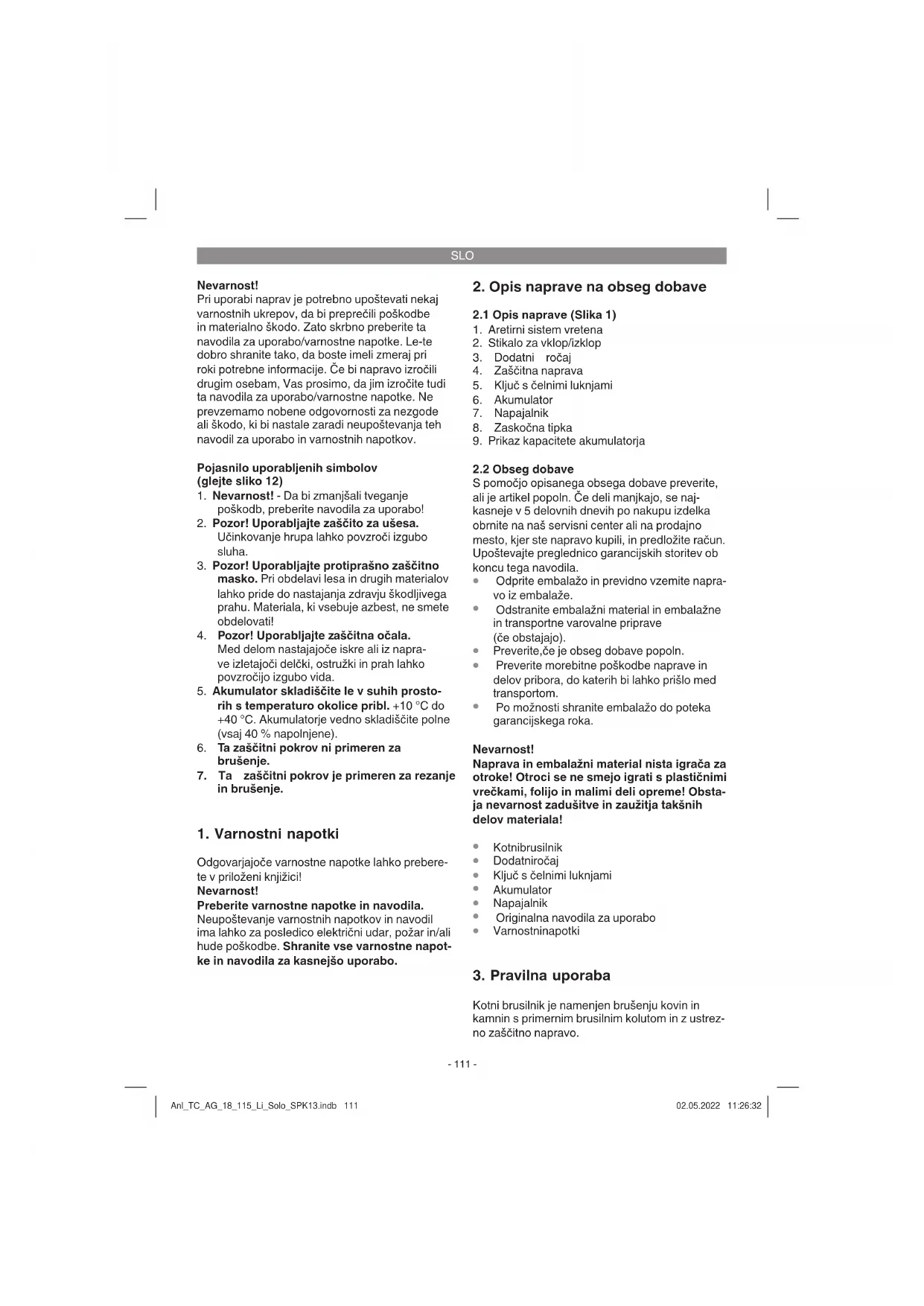 Pozor! Kotni brusilnik lahko za ločevanje kovine in kamnin uporabljate le, če je nameščena pred- videna zaščitna naprava, na voljo kot dodatna oprema. Ta stroj se lahko uporablja le v skladu z njeg- ovo namembnostjo. Vsaka druga uporaba šteje kot nenamenska nedovoljena uporaba. Za kakršnekoli poškodbe ali škodo, ki bi nastale zaradi nedovoljene uporabe, nosi odgovornost uporabnik/upravljalec in ne proizvajalec. Prosimo, da upoštevate, da naše naprave niso bile konstruirane za namene uporabe v obrtništvu ali industriji. Ne prevzemamo nobene odgovor- nosti, če je bila naprava uporabljana v obrtništvu ali industriji ter v podobnih dejavnostih.