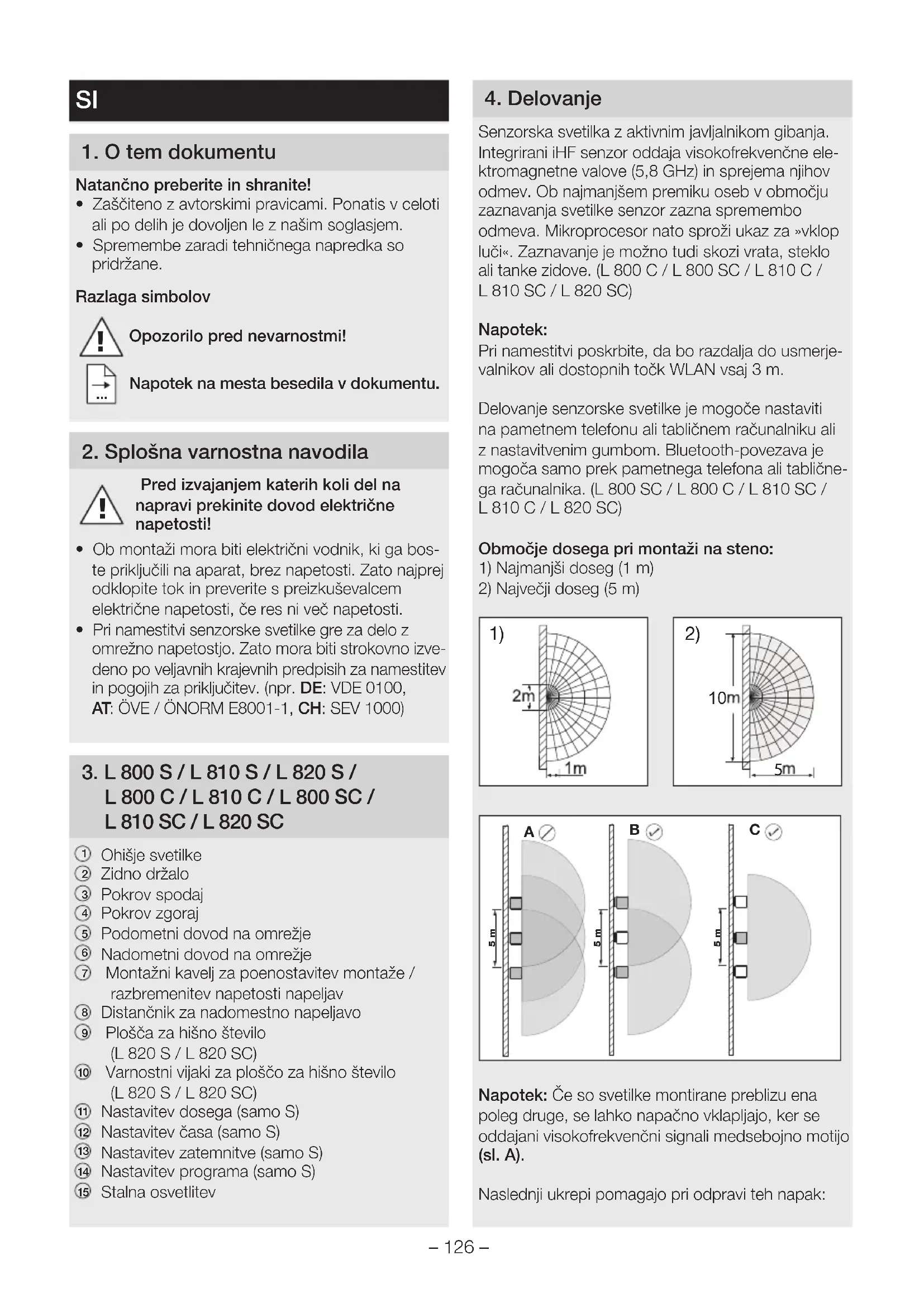 Senzorska svetilka z aktivnim javljalnikom gibanja. Integrirani iHF senzor oddaja visokofrekvenčne ele-ktromagnetne valove (5,8 GHz) in sprejema njihov odmev. Ob najmanjšem premiku oseb v območju zaznavanja svetilke senzor zazna spremembo odmeva. Mikroprocesor nato sproži ukaz za »vklop luči«. Zaznavanje je možno tudi skozi vrata, steklo ali tanke zidove. (L800C / L800SC / L810C / L810SC / L820SC)Napotek:Pri namestitvi poskrbite, da bo razdalja do usmerje-valnikov ali dostopnih točk WLAN vsaj 3 m.Delovanje senzorske svetilke je mogoče nastaviti na pametnem telefonu ali tabličnem računalniku ali z nastavitvenim gumbom. Bluetooth-povezava je mogoča samo prek pametnega telefona ali tablične-ga računalnika. (L800SC/ L800C/ L810SC/ L810C/ L820SC)Območje dosega pri montaži na steno:1) Najmanjši doseg (1m)2) Največji doseg (5m)