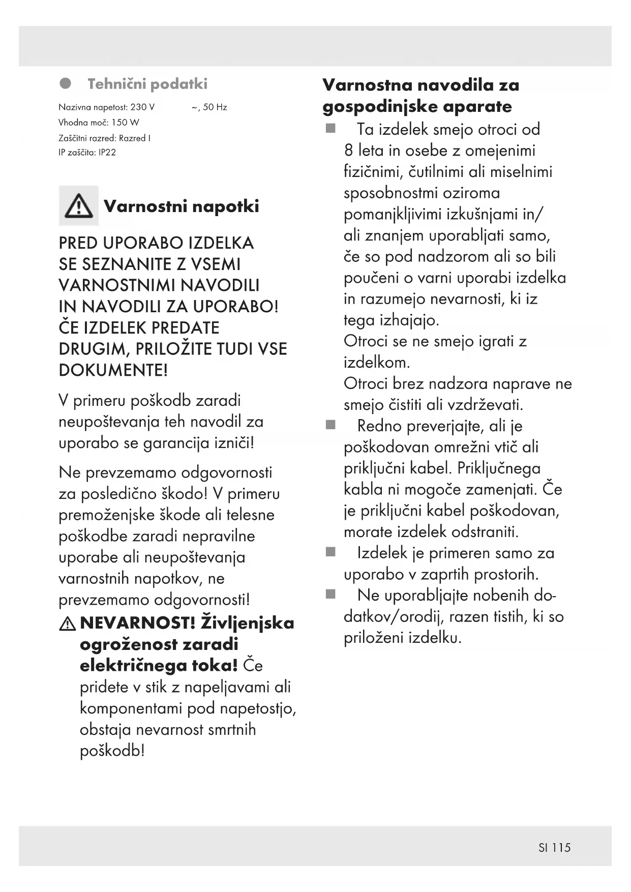 NEVARNOST! Življenjska ogroženost zaradi električnega toka! Če pridete v stik z napeljavami ali komponentami pod napetostjo, obstaja nevarnost smrtnih poškodb! Varnostna navodila za gospodinjske aparate Ta izdelek smejo otroci od 8leta in osebe z omejenimi fizičnimi, čutilnimi ali miselnimi sposobnostmi oziroma pomanjkljivimi izkušnjami in/ ali znanjem uporabljati samo, če so pod nadzorom ali so bili poučeni o varni uporabi izdelka in razumejo nevarnosti, ki iz tega izhajajo. Otroci se ne smejo igrati z izdelkom. Otroci brez nadzora naprave ne smejo čistiti ali vzdrževati. Redno preverjajte, ali je poškodovan omrežni vtič ali priključni kabel. Priključnega kabla ni mogoče zamenjati. Če je priključni kabel poškodovan, morate izdelek odstraniti. Izdelek je primeren samo za uporabo v zaprtih prostorih. Ne uporabljajte nobenih do- datkov/orodij, razen tistih, ki so priloženi izdelku.116