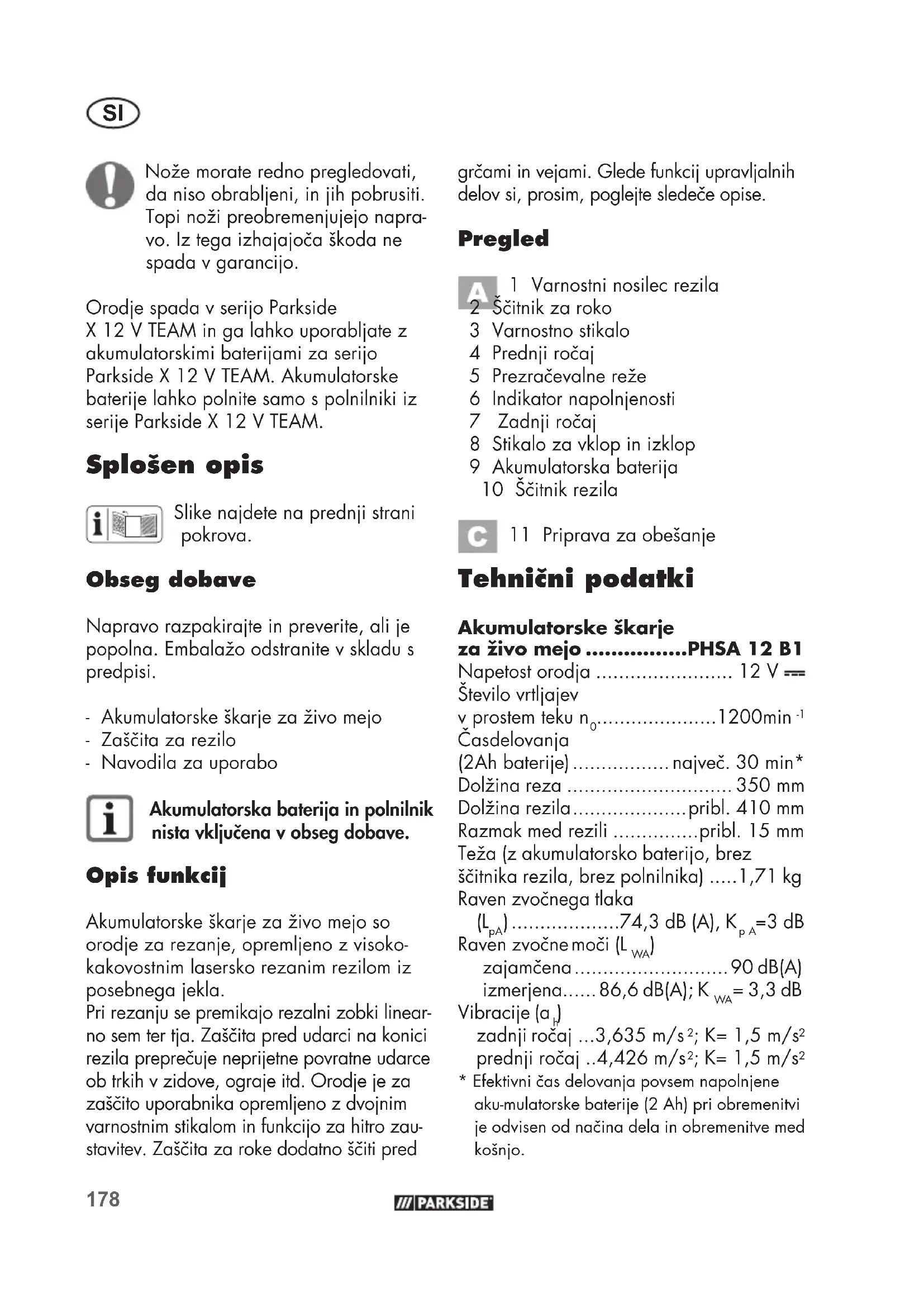 Nože morate redno pregledovati, da niso obrabljeni, in jih pobrusiti. Topi noži preobremenjujejo napra- vo. Iz tega izhajajoča škoda ne spada v garancijo. Orodje spada v serijo Parkside X12VTEAM in ga lahko uporabljate z akumulatorskimi baterijami za serijo Parkside X12VTEAM. Akumulatorske baterije lahko polnite samo s polnilniki iz serije Parkside X12VTEAM. Splošen opis Slike najdete na prednji strani pokrova. Obseg dobave Napravo razpakirajte in preverite, ali je popolna. Embalažo odstranite v skladu s predpisi. - Akumulatorske škarje za živo mejo - Zaščita za rezilo - Navodila za uporabo Akumulatorska baterija in polnilnik nista vključena v obseg dobave. Opis funkcij Akumulatorske škarje za živo mejo so orodje za rezanje, opremljeno z visoko- kakovostnim lasersko rezanim rezilom iz posebnega jekla. Pri rezanju se premikajo rezalni zobki linear- no sem ter tja. Zaščita pred udarci na konici rezila preprečuje neprijetne povratne udarce ob trkih v zidove, ograje itd. Orodje je za zaščito uporabnika opremljeno z dvojnim varnostnim stikalom in funkcijo za hitro zau- stavitev. Zaščita za roke dodatno ščiti pred grčami in vejami. Glede funkcij upravljalnih delov si, prosim, poglejte sledeče opise. Pregled 1 Varnostni nosilec rezila 2 Ščitnik za roko 3 Varnostno stikalo 4 Prednji ročaj 5 Prezračevalne reže 6 Indikator napolnjenosti 7 Zadnji ročaj 8 Stikalo za vklop in izklop 9 Akumulatorska baterija 10 Ščitnik rezila 11 Priprava za obešanje Tehnični podatki Akumulatorske škarje za živo mejo ................PHSA 12 B1 Napetost orodja ........................ 12 V Število vrtljajev v prostem teku n