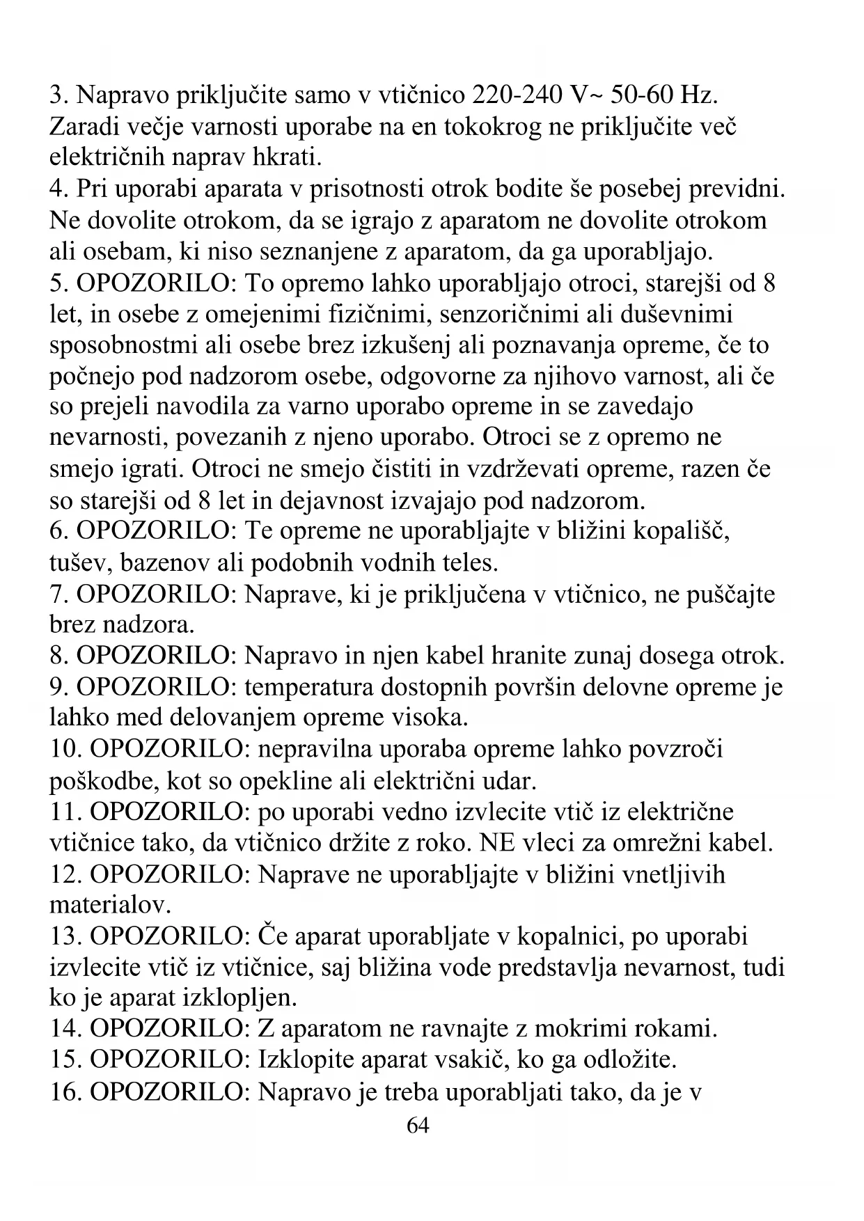 7. OPOZORILO: Naprave, ki je priključena v vtičnico, ne puščajte