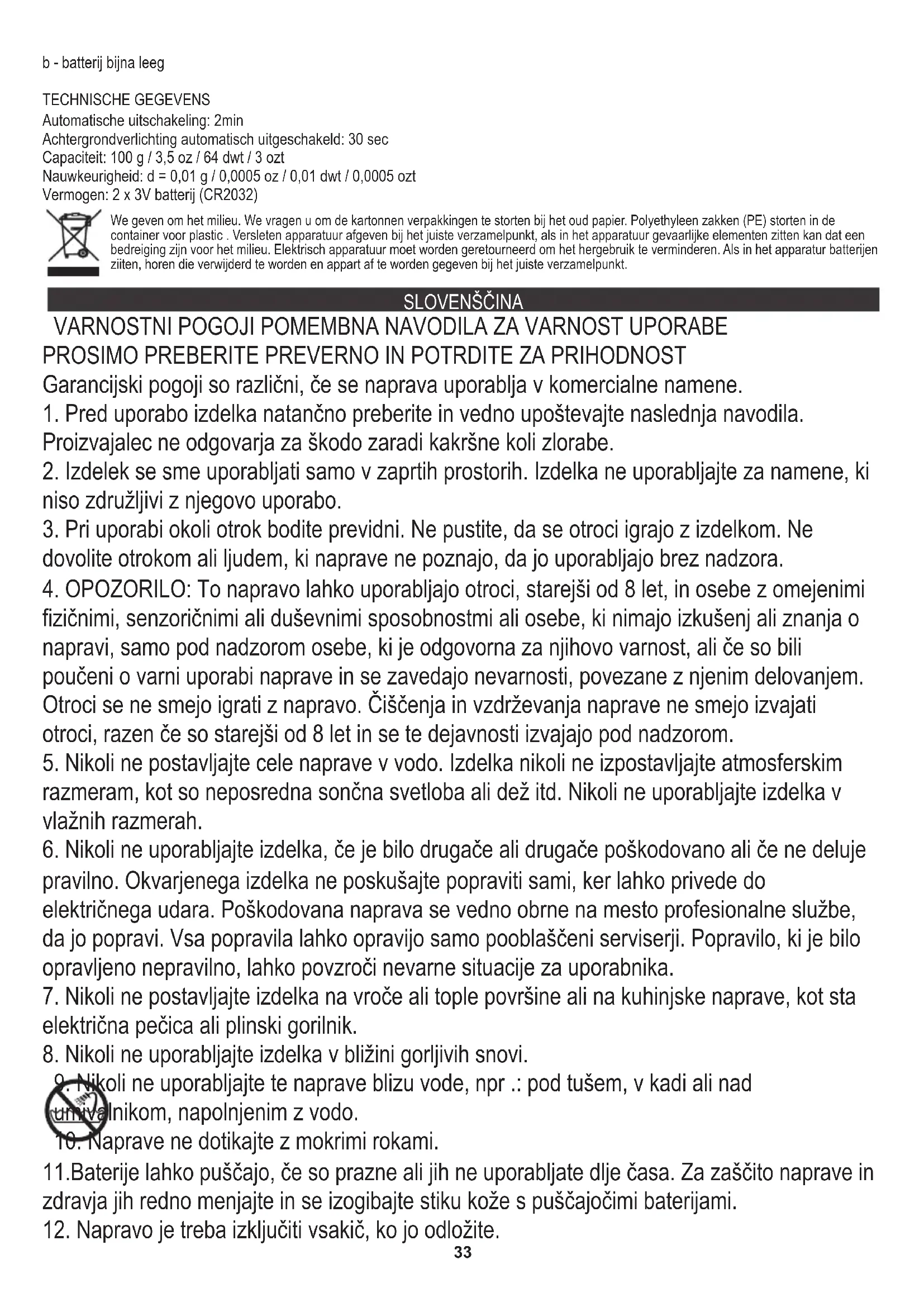dovolite otrokom ali ljudem, ki naprave ne poznajo, da jo uporabljajo brez nadzora. umivalnikom, napolnjenim z vodo.34 Skrbimo za okolje. Kartonska embalaža, prosim darovati na odpadni papir. Polietilenske vreče (PE) mečite v posoda za plastiko. Dotrajane naprave je treba vrniti na ustrezno zbirno mesto, ker vsebovane v napravo nevarne elemente lahko predstavljajo nevarnost za okolje. Električna naprava je treba vrniti kakor, da se omeji njegovo ponovno uporabo in izkoriščenost. Če naprava vsebuje baterio, je treba odstraniti in ločeno dati nazaj na mesta skladiščenja.