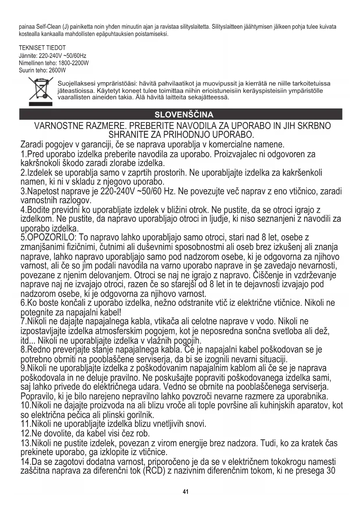Varoitus: Höyryiskutoimintoa voidaan käyttää ainoastaan korkeimmilla lämpötiloilla. Älä käytä painiketta termostaatin merkkivalon palaessa. Voit käyttää pystysilitystä ainoastaan merkkivalon sammuessa. Säiliössä oleva erikoishartsisuodatin pehmentää vettä ja estää kalkin saostumisen silitysraudan alustaan. Suodatin on kiinteästi asennettu eikä vaadi huoltoa. Höyrynsyötön sammuttamiseksi aseta höyryn säädin ”0”-asentoon. VINKIT 2. Mikäli kangas on valmistettu eri aineista (esim. 40% puuvillaa, 60% tekokuitua), aseta termostaatti sen materiaalin mukaan, jonka silityslämpötila on pienempi (tässä tapauksessa tekokuidun, eli matala silityslämpötila). 7. Silitysjälkien ehkäisemiseksi samettikankaassa, silitä sitä yhteen suuntaan (kuitua pitkin) ja vältä silitysraudan painamista kangasta vastaan. HUOM: Varmista, että säiliö (K) on täytetty vedellä. Paina suihkauspainiketta (D) hitaasti (yhtenäistä vesivirtaa varten) tai nopeasti (suihkausta varten). Käytä ainoastaan vesihanavettä. Tislattu/demineralisoitu vesi vaikuttaa kielteisesti suodattimen fyysisiin ja kemiallisiin ominaisuuksiin, jonka vuoksi se menettää tehokkuutensa. Self-Clean toiminto Kalkin suodatusjärjestelmä (Anti-Calc) Suihkaustoiminto 40painaa Self-Clean (J) painiketta noin yhden minuutin ajan ja ravistaa silityslaitetta. Silityslaitteen jäähtymisen jälkeen pohja tulee kuivata kostealla kankaalla mahdollisten epäpuhtauksien poistamiseksi. TEKNISET TIEDOT Jännite: 220-240V ~50/60Hz Nimellinen teho: 1800-2200W Suurin teho: 2600W Suojellaksesi ympräristöäsi: hävitä pahvilaatikot ja muovipussit ja kierrätä ne niille tarkoitetuissa jäteastioissa. Käytetyt koneet tulee toimittaa niihin erioistuneisiin keräyspisteisiin ympäristölle vaarallisten aineiden takia. Älä hävitä laitteita sekajätteessä. VARNOSTNE RAZMERE. PREBERITE NAVODILA ZA UPORABO IN JIH SKRBNO SHRANITE ZA PRIHODNJO UPORABO. 1.Pred uporabo izdelka preberite navodila za uporabo. Proizvajalec ni odgovoren za kakršnokoli škodo zaradi zlorabe izdelka. 5.OPOZORILO: To napravo lahko uporabljajo samo otroci, stari nad 8 let, osebe z zmanjšanimi fizičnimi, čutnimi ali duševnimi sposobnostmi ali oseb brez izkušenj ali znanja naprave, lahko napravo uporabljajo samo pod nadzorom osebe, ki je odgovorna za njihovo varnost, ali če so jim podali navodila na varno uporabo naprave in se zavedajo nevarnosti, povezane z njenim delovanjem. Otroci se naj ne igrajo z napravo. Čiščenje in vzdrževanje naprave naj ne izvajajo otroci, razen če so starejši od 8 let in te dejavnosti izvajajo pod nadzorom osebe, ki je odgovorna za njihovo varnost. 2.Izdelek se uporablja samo v zaprtih prostorih. Ne uporabljajte izdelka za kakršenkoli namen, ki ni v skladu z njegovo uporabo. 6.Ko boste končali z uporabo izdelka, nežno odstranite vtič iz električne vtičnice. Nikoli ne potegnite za napajalni kabel! 7.Nikoli ne dajajte napajalnega kabla, vtikača ali celotne naprave v vodo. Nikoli ne izpostavljajte izdelka atmosferskim pogojem, kot je neposredna sončna svetloba ali dež, itd... Nikoli ne uporabljajte izdelka v vlažnih pogojih. 3.Napetost naprave je 220-240V ~50/60 Hz. Ne povezujte več naprav z eno vtičnico, zaradi varnostnih razlogov. 4.Bodite previdni ko uporabljate izdelek v bližini otrok. Ne pustite, da se otroci igrajo z izdelkom. Ne pustite, da napravo uporabljajo otroci in ljudje, ki niso seznanjeni z navodili za uporabo izdelka. Zaradi pogojev v garanciji, če se naprava uporablja v komercialne namene. 8.Redno preverjajte stanje napajalnega kabla. Če je napajalni kabel poškodovan se je potrebno obrniti na pooblaščene serviserja, da bi se izognili nevarni situaciji. 9.Nikoli ne uporabljajte izdelka z poškodovanim napajalnim kablom ali če se je naprava poškodovala in ne deluje pravilno. Ne poskušajte popraviti poškodovanega izdelka sami, saj lahko privede do električnega udara. Vedno se obrnite na pooblaščenega serviserja. Popravilo, ki je bilo narejeno nepravilno lahko povzroči nevarne razmere za uporabnika. 13.Nikoli ne pustite izdelek, povezan z virom energije brez nadzora. Tudi, ko za kratek čas prekinete uporabo, ga izklopite iz vtičnice. 10.Nikoli ne dajajte proizvoda na ali blizu vroče ali tople površine ali kuhinjskih aparatov, kot so električna pečica ali plinski gorilnik. 14.Da se zagotovi dodatna varnost, priporočeno je da se v električnem tokokrogu namesti zaščitna naprava za diferenčni tok (RCD) z nazivnim diferenčnim tokom, ki ne presega 30 11.Nikoli ne uporabljajte izdelka blizu vnetljivih snovi. 12.Ne dovolite, da kabel visi čez rob. SLOVENŠČINA 4125. Železo je treba uporabljati na stabilni ravni površini in le na tej površini ga lahko zapustite. H. Kontrolna luč za termostat