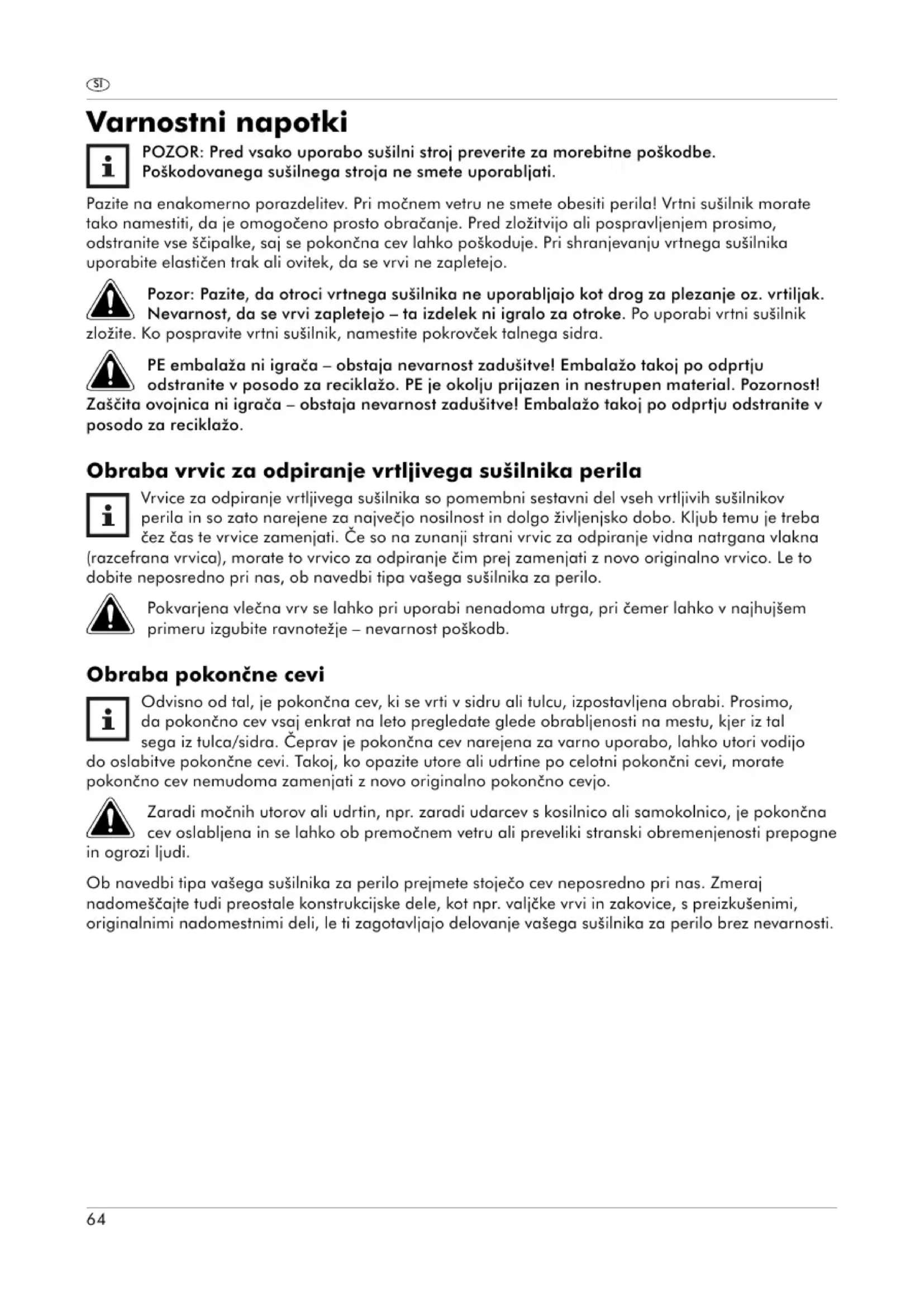 POZOR: Pred vsako uporabo sušilni stroj preverite za morebitne poškodbe. Poškodovanega sušilnega stroja ne smete uporabljati. Pazite na enakomerno porazdelitev. Pri močnem vetru ne smete obesiti perila! Vrtni sušilnik morate tako namestiti, da je omogočeno prosto obračanje. Pred zložitvijo ali pospravljenjem prosimo, odstranite vse ščipalke, saj se pokončna cev lahko poškoduje. Pri shranjevanju vrtnega sušilnika uporabite elastičen trak ali ovitek, da se vrvi ne zapletejo.