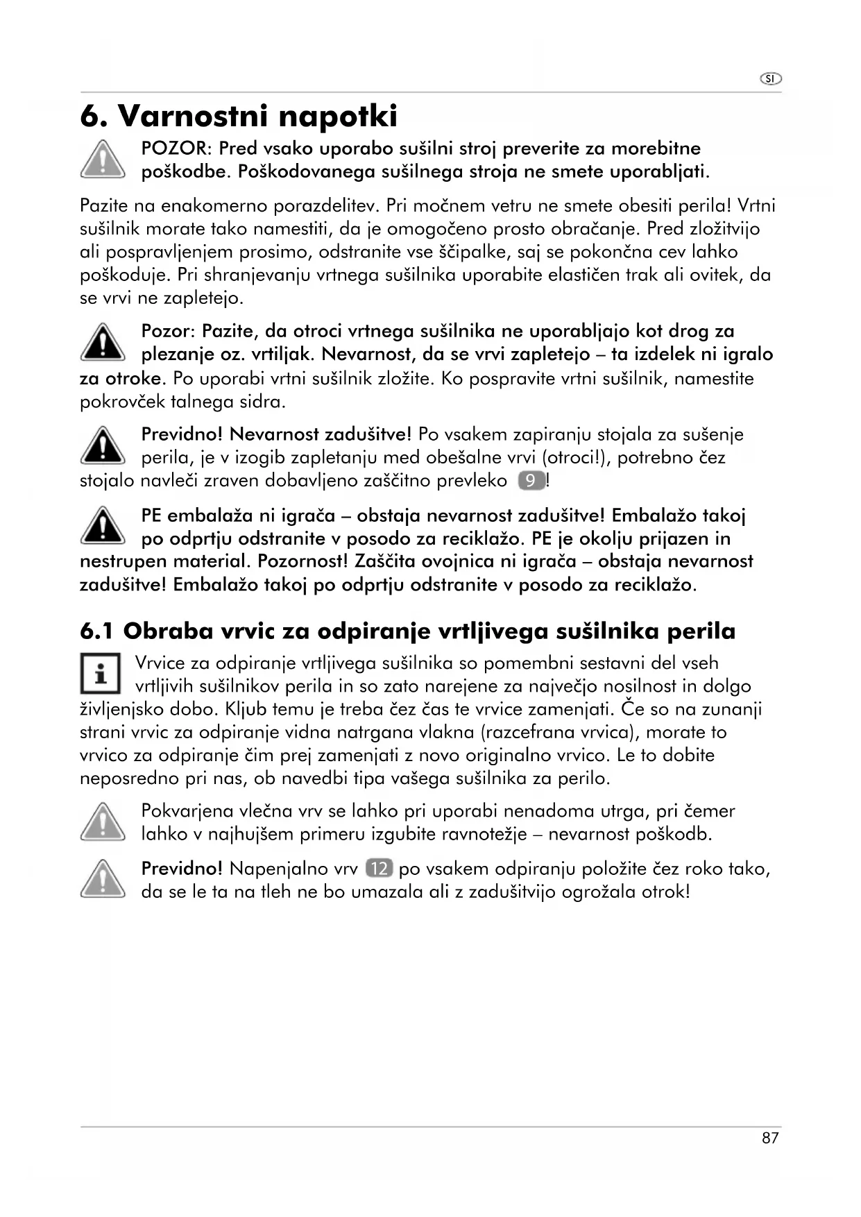 To stojalo za perilo je namenjeno samo za suaenje perila za domao uporabo. Sušilnik perila uporabljajte zgolj tako, kot je opisano v teh navodilih za uporabo. Sleherna siceršnja uporaba velja za nenamensko in lahko privede do materilne škode ali celo do poškodb oseb. Sušilnik perila ni otroška igrača. Proizvajalec ali trgovec ne prevzemata nobene odgovornosti za škodo, ki bi nastala zaradi nenamenske ali napačne uporabe.86