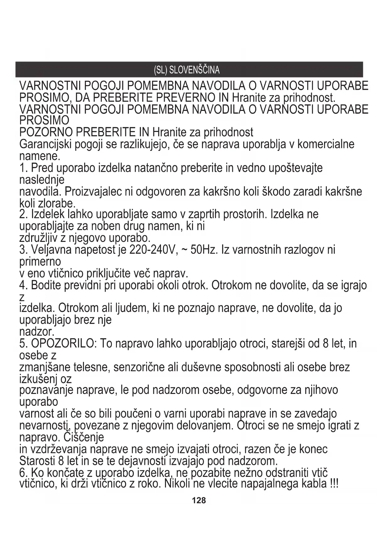 3. Veljavna napetost je 220-240V, ~ 50Hz. Iz varnostnih razlogov ni