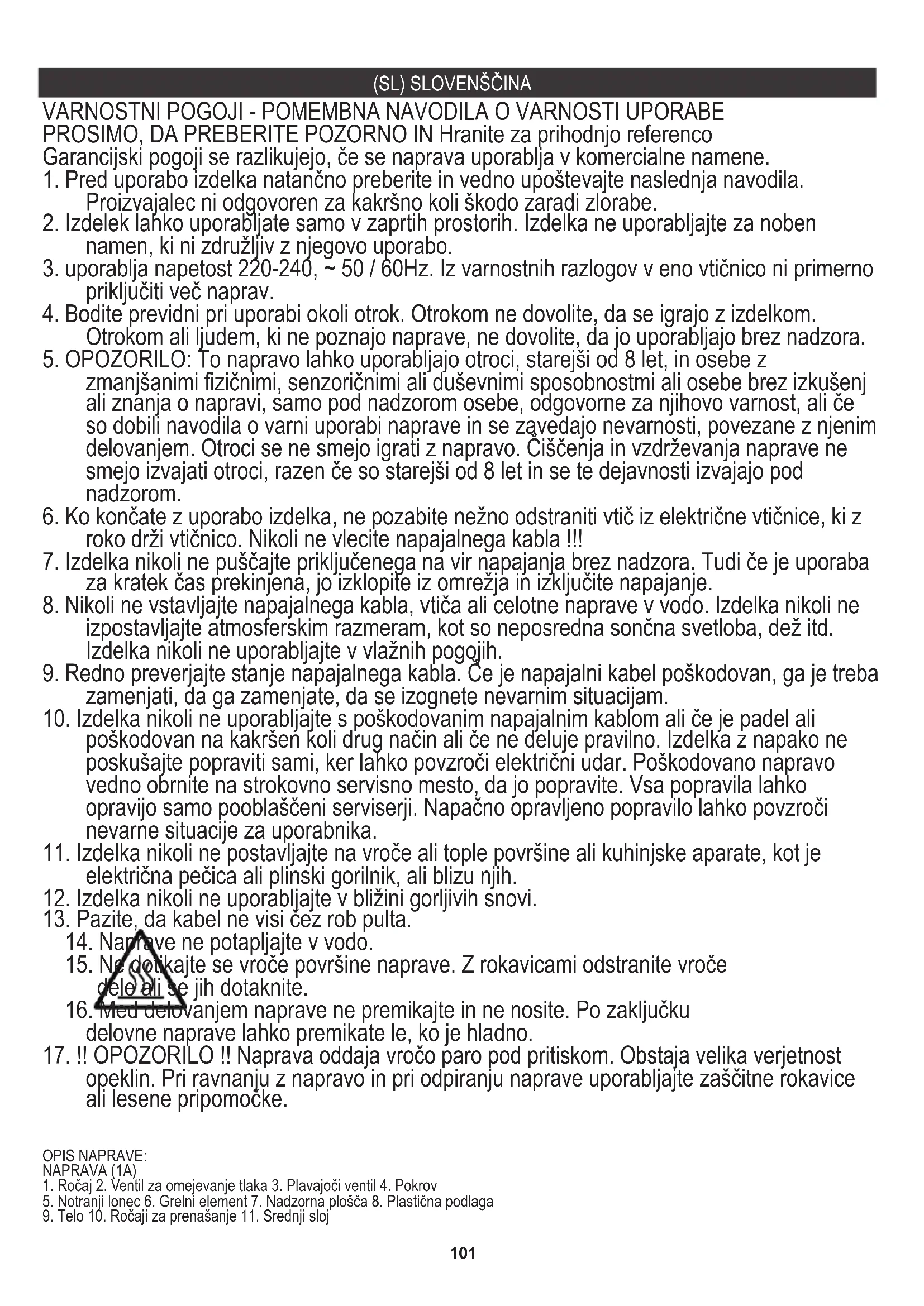 17. !! OPOZORILO !! Naprava oddaja vročo paro pod pritiskom. Obstaja velika verjetnost