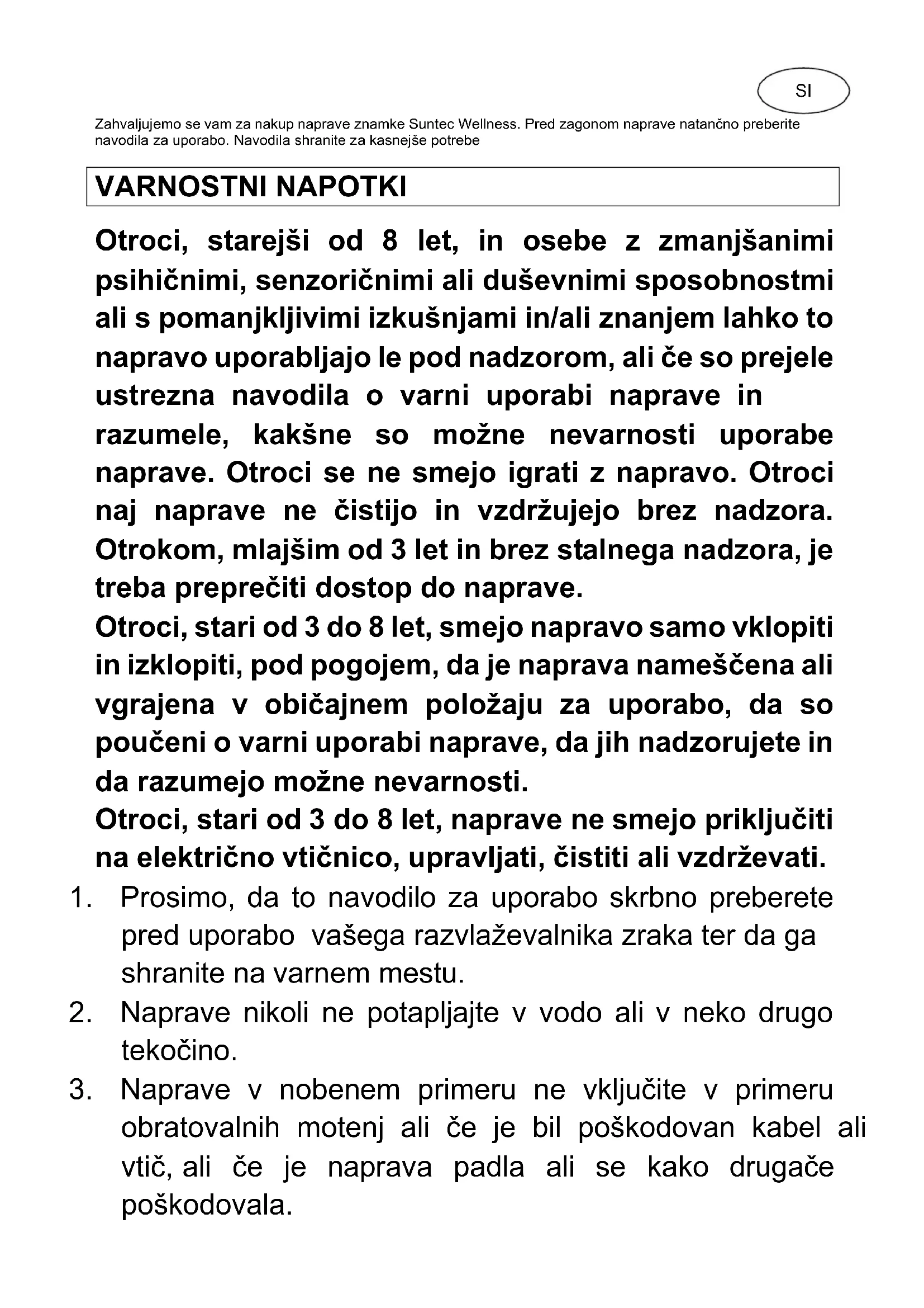Otroci, starejši od 8 let, in osebe z zmanjšanimi psihičnimi, senzoričnimi ali duševnimi sposobnostmi ali s pomanjkljivimi izkušnjami in/ali znanjem lahko to napravo uporabljajo le pod nadzorom, ali če so prejele ustrezna navodila o varni uporabi naprave in razumele, kakšne so možne nevarnosti uporabe naprave. Otroci se ne smejo igrati z napravo. Otroci naj naprave ne čistijo in vzdržujejo brez nadzora. Otrokom, mlajšim od 3 let in brez stalnega nadzora, je treba preprečiti dostop do naprave. Otroci, stari od 3 do 8 let, smejo napravo samo vklopiti in izklopiti, pod pogojem, da je naprava nameščena ali vgrajena v običajnem položaju za uporabo, da so poučeni o varni uporabi naprave, da jih nadzorujete in da razumejo možne nevarnosti. Otroci, stari od 3 do 8 let, naprave ne smejo priključiti na električno vtičnico, upravljati, čistiti ali vzdrževati.