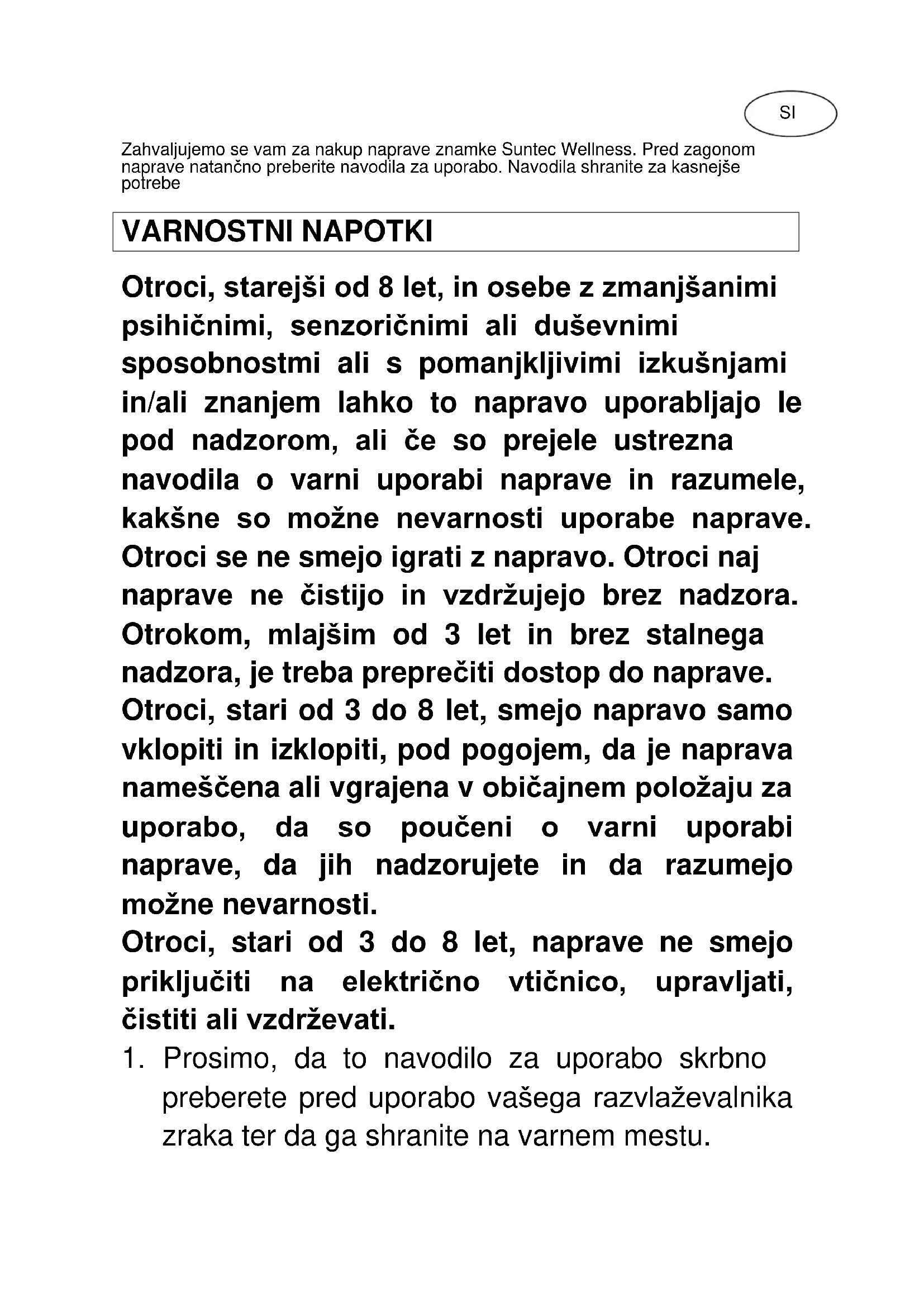 DryFix SUNTEC WELLNESS GMBH / HOLZSTRASSE 2 / 40 221 DÜSSELDORF / GERMANYZahvaljujemo se vam za nakup naprave znamke Suntec Wellness. Pred zagonom naprave natančno preberite navodila za uporabo. Navodila shranite za kasnejše potrebe VARNOSTNI NAPOTKI Otroci, starejši od 8 let, in osebe z zmanjšanimi psihičnimi, senzoričnimi ali duševnimi sposobnostmi ali s pomanjkljivimi izkušnjami in/ali znanjem lahko to napravo uporabljajo le pod nadzorom, ali če so prejele ustrezna navodila o varni uporabi naprave in razumele, kakšne so možne nevarnosti uporabe naprave. Otroci se ne smejo igrati z napravo. Otroci naj naprave ne čistijo in vzdržujejo brez nadzora. Otrokom, mlajšim od 3 let in brez stalnega nadzora, je treba preprečiti dostop do naprave. Otroci, stari od 3 do 8 let, smejo napravo samo vklopiti in izklopiti, pod pogojem, da je naprava nameščena ali vgrajena v običajnem položaju za uporabo, da so poučeni o varni uporabi naprave, da jih nadzorujete in da razumejo možne nevarnosti. Otroci, stari od 3 do 8 let, naprave ne smejo priključiti na električno vtičnico, upravljati, čistiti ali vzdrževati.