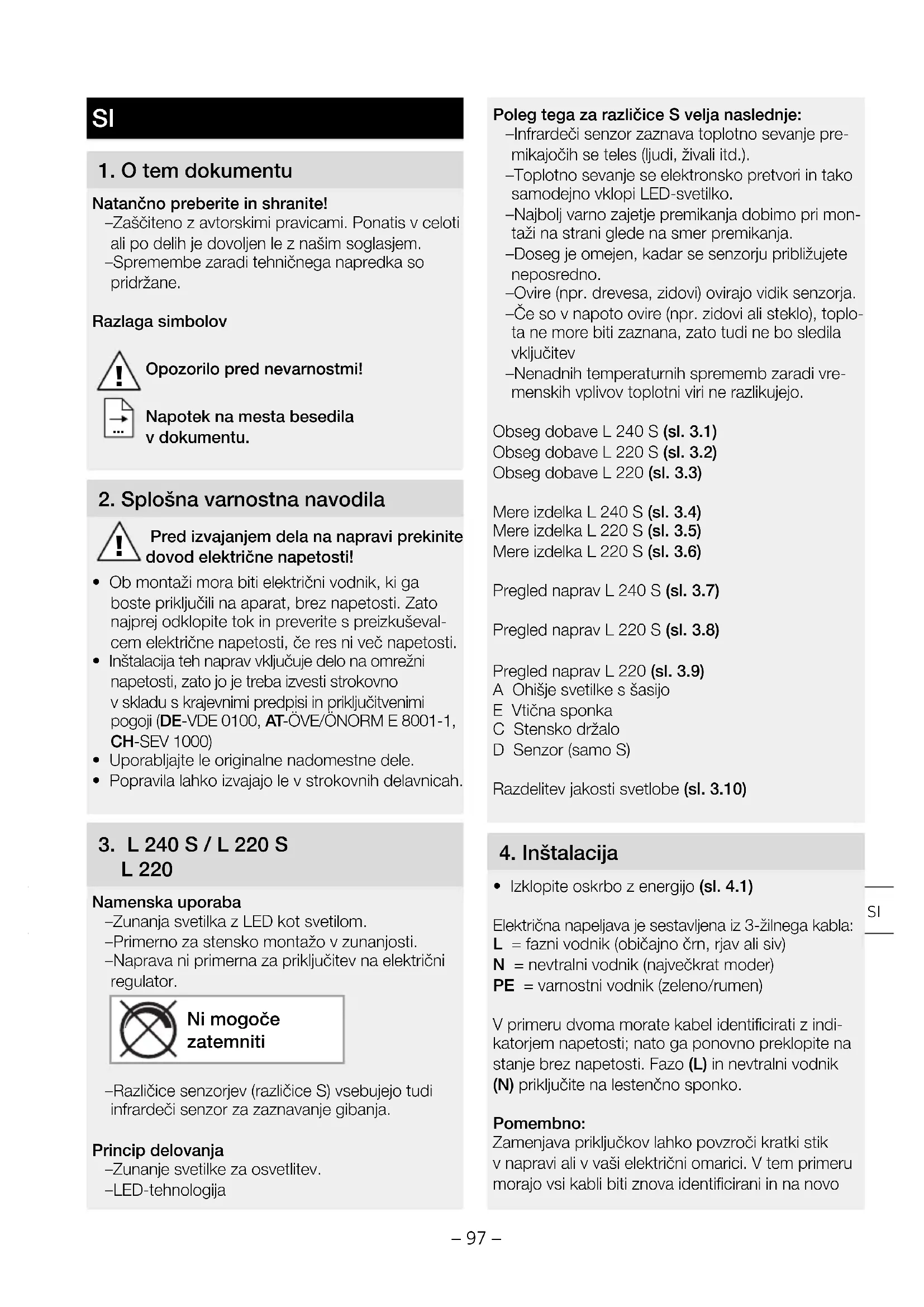 L 220 Namenska uporaba – Zunanja svetilka z LED kot svetilom. – Primerno za stensko montažo v zunanjosti. – Naprava ni primerna za priključitev na električni regulator. Ni mogoče zatemniti – Različice senzorjev (različice S) vsebujejo tudi infrardeči senzor za zaznavanje gibanja. Princip delovanja – Zunanje svetilke za osvetlitev. – LED-tehnologija Poleg tega za različice S velja naslednje: – Infrardeči senzor zaznava toplotno sevanje pre- mikajočih se teles (ljudi, živali itd.). – Toplotno sevanje se elektronsko pretvori in tako samodejno vklopi LED-svetilko. – Najbolj varno zajetje premikanja dobimo pri mon- taži na strani glede na smer premikanja. – Doseg je omejen, kadar se senzorju približujete neposredno. – Ovire (npr. drevesa, zidovi) ovirajo vidik senzorja. – Če so v napoto ovire (npr. zidovi ali steklo), toplo- ta ne more biti zaznana, zato tudi ne bo sledila vključitev – Nenadnih temperaturnih sprememb zaradi vre- menskih vplivov toplotni viri ne razlikujejo. Obseg dobave L 240 S (sl. 3.1) Obseg dobave L 220 S (sl. 3.2) Obseg dobave L220 (sl. 3.3) Mere izdelka L 240 S (sl. 3.4) Mere izdelka L 220 S (sl. 3.5) Mere izdelka L 220 S (sl. 3.6) Pregled naprav L 240 S (sl. 3.7) Pregled naprav L 220 S (sl. 3.8) Pregled naprav L 220 (sl. 3.9) A Ohišje svetilke s šasijo E Vtična sponka C Stensko držalo D Senzor (samo S) Razdelitev jakosti svetlobe (sl. 3.10)