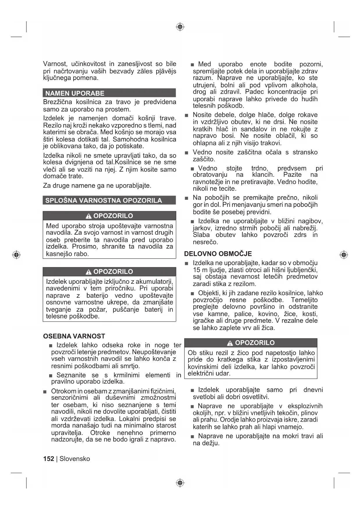 ■ Izdelka ne uporabljajte, kadar so v območju 15 m ljudje, zlasti otroci ali hišni ljubljenčki, saj obstaja nevarnost letečih predmetov zaradi stika z rezilom. ■ Objekti, ki jih zadane rezilo kosilnice, lahko povzročijo resne poškodbe. Temeljito preglejte delovno površino in odstranite vse kamne, palice, kovino, žice, kosti, igračke ali druge predmete. V rezalne dele se lahko zaplete vrv ali žica. OPOZORILO Ob stiku rezil z žico pod napetostjo lahko pride do kratkega stika z izpostavljenimi kovinskimi deli izdelka, kar lahko povzroči električni udar. ■ Izdelek uporabljajte samo pri dnevni svetlobi ali dobri osvetlitvi. ■ Naprave ne uporabljajte v eksplozivnih okoljih, npr. v bližini vnetljivih tekočin, plinov ali prahu. Orodje lahko proizvaja iskre, zaradi katerih se lahko prah ali hlapi vnamejo. ■ Naprave ne uporabljajte na mokri travi ali na dežju. 152 | Slovensko■ Izdelka ne uporabljajte v primeru pojava nevihte. ■ Pomnite, da je upravitelj oz. uporabnik odgovoren za nesreče ali nevarnosti, ki se pripetijo ostalim ljudem ali njihovi lastnini. ■ Če upravitelj ni pozoren na prisotnost otrok, se lahko pripetijo tragične nesreče. Otroke stroj in košnja pogosto zanimata. Nikoli ne domnevajte, da bo otrok ostal tam, kjer ste ga zadnjič videli. ■ Otroci naj bodo izven območja košnje in pod skrbnim nadzorom odgovorne odrasle osebe, ki ne uporablja kosilnice; bodite pozorni nanje in kosilnico izklopite, če otroci vstopijo v območje. ■ Med približevanjem nepreglednim ovinkom, živim mejam, drevesom ali drugim predmetom, vključno z visečimi živimi mejami, ki lahko ovirajo pogled, bodite posebej previdni. UPORABA