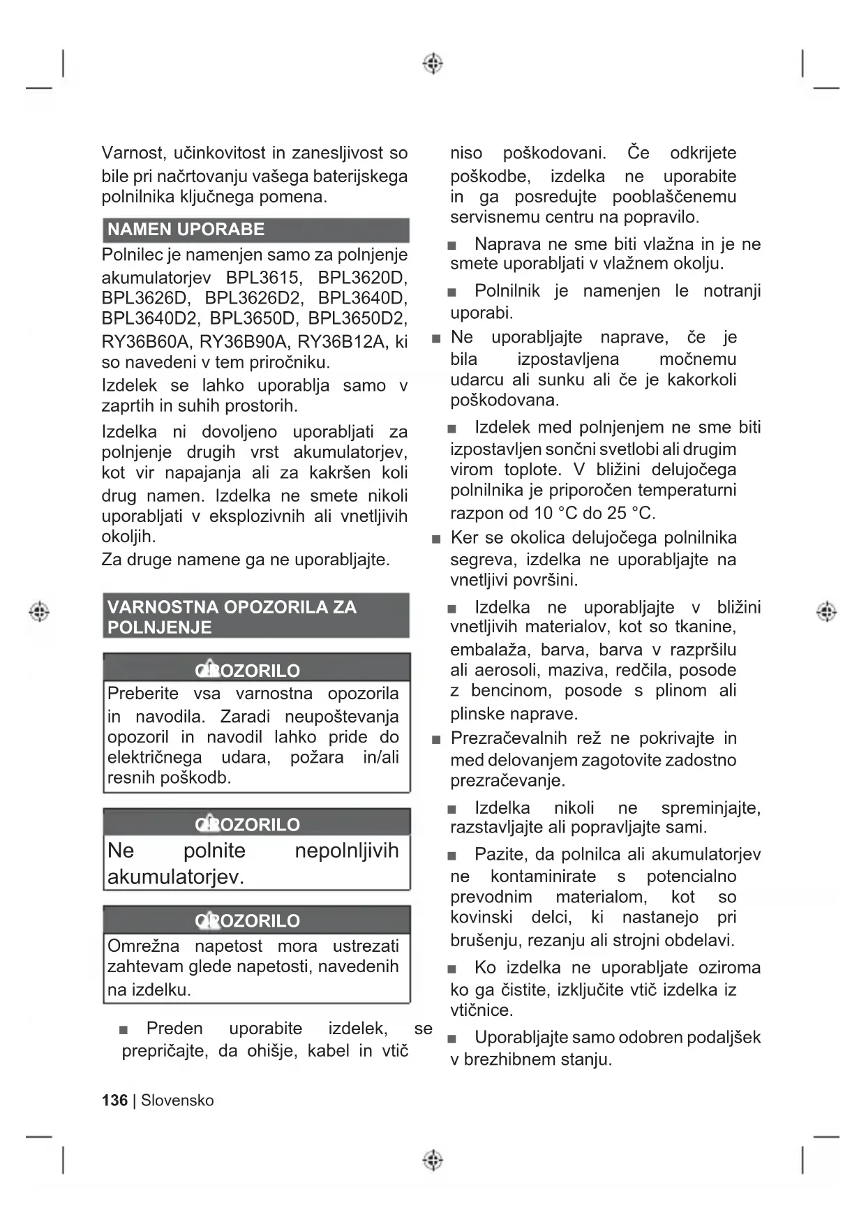Baterija je napunjena — Upaljena Završen je način rada brzog punjenja i punjač nastavlja s punjenjem.136 | Slovensko Varnost, učinkovitost in zanesljivost so bile pri načrtovanju vašega baterijskega polnilnika ključnega pomena. NAMEN UPORABE Polnilec je namenjen samo za polnjenje akumulatorjev BPL3615, BPL3620D, BPL3626D, BPL3626D2, BPL3640D, BPL3640D2, BPL3650D, BPL3650D2, RY36B60A, RY36B90A, RY36B12A, ki so navedeni v tem priročniku. Izdelek se lahko uporablja samo v zaprtih in suhih prostorih. Izdelka ni dovoljeno uporabljati za polnjenje drugih vrst akumulatorjev, kot vir napajanja ali za kakršen koli drug namen. Izdelka ne smete nikoli uporabljati v eksplozivnih ali vnetljivih okoljih. Za druge namene ga ne uporabljajte.