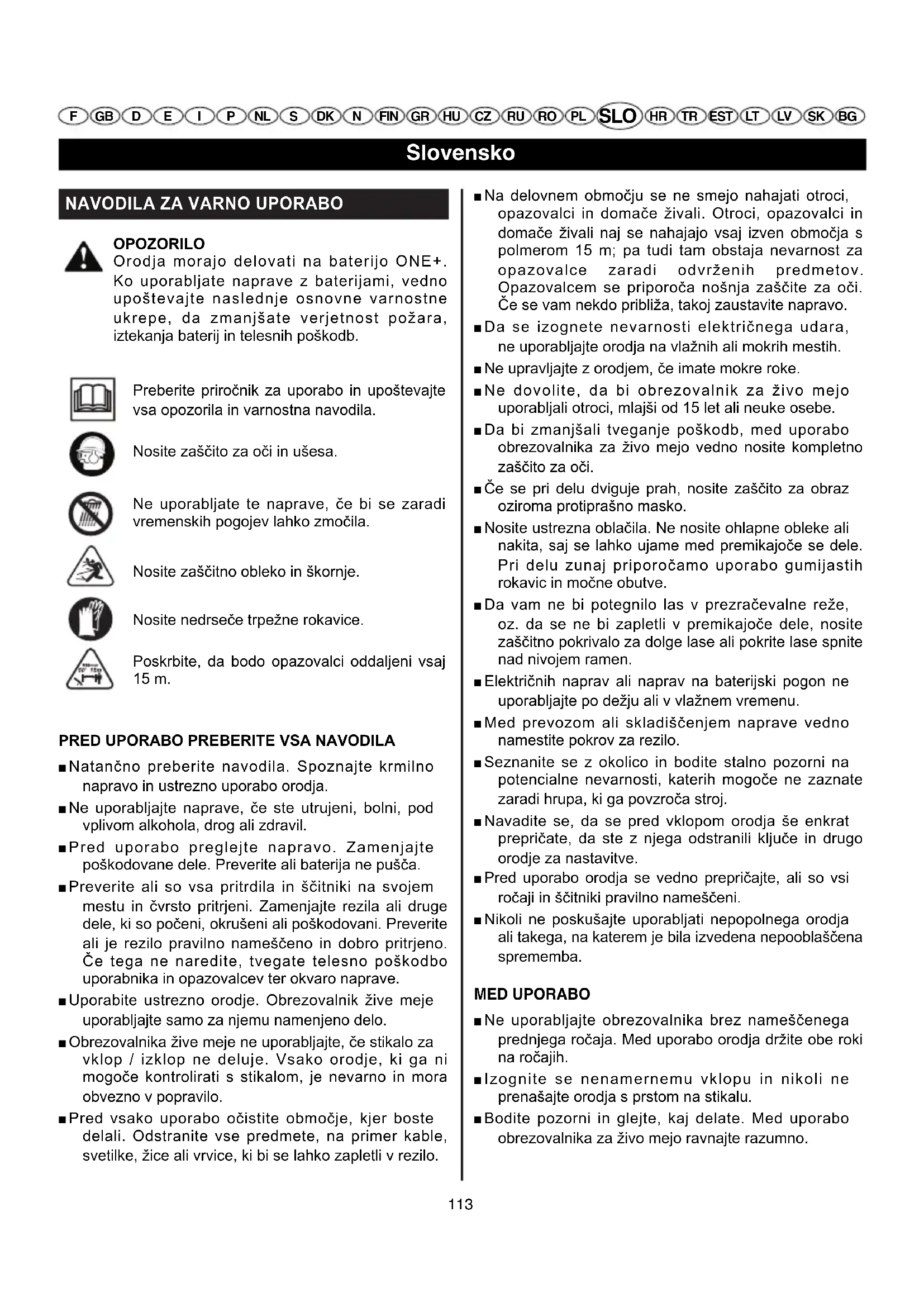 Slovensko SLO F GB D E I P NL S DK N FIN GR HU CZ RU RO PL HR TR EST LT LV SK BG Preberite priročnik za uporabo in upoštevajte vsa opozorila in varnostna navodila. Nosite zaščito za oči in ušesa. Ne uporabljate te naprave, če bi se zaradi vremenskih pogojev lahko zmočila. Nosite zaščitno obleko in škornje. Nosite nedrseče trpežne rokavice. Poskrbite, da bodo opazovalci oddaljeni vsaj 15 m. OHT-1845_25 lgs 12/09/06 13:53 Page 113NAVODILA ZA VARNO UPORABO ■ Oblecite trpežne dolge hlače, močne škornje in dobro prilegajoče se rokavice. Ne nosite kratkih hlač, sandal in ne hodite bosi. ■ Ne delajte v slabih svetlobnih pogojih. Orodje uporabljajte le pri dnevni ali močni umetni svetlobi. ■ Ne segajte predaleč in ne stojte na nestabilni podpori. V vsakem trenutku skrbite za varno oporo nog in ravnotežje. Orodja ne uporabljajte na lestvi. ■ Obrezovalnika za živo mejo ne preobremenjujte. Če ga boste uporabljali s predvideno hitrostjo, bo deloval bolje pa tudi nevarnost poškodb bo manjša. ■ Preden se lotite vzdrževanja, popravil ali nastavitev, izklopite stikalo, počakajte, da se motor zaustavi in odstranite baterijo. ■ Ta obrezovalnik uporabljajte samo za obrezovanje žive meje in grmovja. Ne uporabljajte ga za noben drug namen. ■ Pred zagonom naprave se prepričajte, da rezila ne bodo prišla v stik s kakim predmetom. ■ Če zadenete ob neki predmet ali se vanj zapletete, takoj zaustavite napravo, odstranite baterijo in preverite škodo. Orodja ne uporabljajte, dokler ne popravite poškodbe. Ne uporabljajte naprave z zrahljanimi ali poškodovanimi deli. ■ Pazite, kaj delate. Uporabljajte zdrav razum.■ Obrezovalnik za živo mejo skrbno vzdržujte. Rob rezila mora biti vedno nabrušen in čist, saj bo tako delovalo bolje in bo manj tveganja za poškodbe. Upoštevajte navodila za mazanje in menjavo delovnih pripomočkov. Ročaji naj bodo vedno suhi, čisti in brez ostankov olja ali masti. ■ Preglejte poškodovane dele. Preden nadaljujete z uporabo obrezovalnika za živo mejo, pazljivo preglejte ščitnik ali drug poškodovani del in se prepričajte, da pravilno deluje ter služi svojemu namenu. Prepričajte se, da so premikajoči se deli pravilno naravnani, da se prosto premikajo, da niso poškodovani, da so brezhibno montirani in tudi o vseh ostalih vidikih, ki bi lahko vplivali na delovanje orodja. Zaščitne elemente in druge poškodovane dele mora popraviti pooblaščeni servisni center, razen če v navodilih za uporabo ni določeno drugače. ■ Nevarnost, da se urežete! Roke držite proč od rezil. Ne poskušajte odstraniti odrezanega materiala ali držati materiala, ki ga nameravate odrezati, medtem ko se rezila premikajo. Preden začnete s čiščenjem ostankov, ki blokirajo rezilo, odstranite baterijo in izklopite stikalo za vklop. Ne prijemajte za gola rezila ali rezalne robove, ko želite dvigniti ali ko držite orodje. POZOR Rezila se premikajo tudi potem, ko je naprava izključena. ■ Poskrbite, da so roke, obraz in noge na varni razdalji od premikajočih se delov. Ne dotikajte se in ne poskušajte zaustaviti rezil med premikanjem. ■ Medtem ko čakate na začetek rezanja ali hodite z enega območja rezanja na drugo, vedno ugasnite motor. ■ Poskrbite, da na orodju ne bo ostankov trave in drugih predmetov. Lahko se zagozdijo na rezilih. ■ Napravo hranite na suhem mestu, zaklenjeno ali na visokem mestu, da preprečite nedovoljeno uporabo ali poškodbo. Poskrbite, da orodje ne bo v dosegu otrok ali nepoučenih oseb. ■ Ko naprave ne uporabljate, ponovno namestite pokrov za rezilo. ■ Nikoli ne polivajte ali brizgajte orodja z vodo ali drugimi tekočinami. Ročice naj bodo ves čas suhe, čiste in brez odpadkov. Po vsaki uporabi napravo očistite v skladu z Navodili za skladiščenje. ■ Med prevozom napravo vedno dobro pritrdite.■ Shranite ta navodila. Pogosto jih preglejte in jih uporabljajte, da poučite druge uporabnike. Če napravo komu posodite, mu posodite tudi ta navodila. SERVISIRANJE ■ Orodje sme servisirati izključno usposobljeno servisno osebje. Če izdelek popravlja ali vzdržuje nekvalificirano osebje, lahko pride do poškodbe uporabnika ali škode na izdelku. Tako servisiranje lahko tudi izniči garancijo. ■ Ob servisiranju orodja uporabljajte samo identične rezervne dele. Upoštevajte vsa navodila iz poglavja Vzdrževanje v tem priročniku. Če uporabite nepriporočene dele ali ne upoštevate navodil za vzdrževanje, lahko povzročite električni udar, resne poškodbe uporabnika ali škodo na izdelku. Tako servisiranje lahko tudi izniči garancijo. ■ Pri zamenjavi rezila, morate zamenjati celoten sestav rezila.