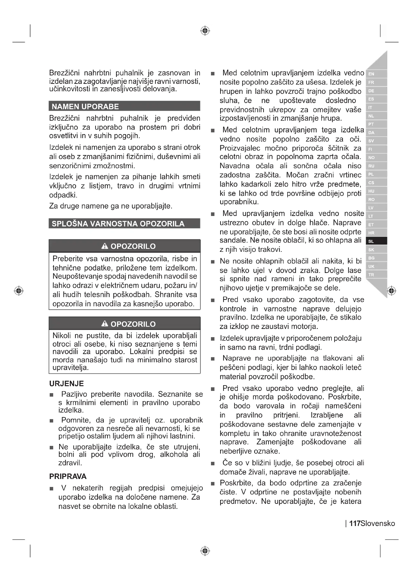 OPOZORILO Preberite vsa varnostna opozorila, risbe in tehniþne podatke, priložene tem izdelkom. Neupoštevanje spodaj navedenih navodil se lahko odrazi v elektriþnem udaru, požaru in/ ali hudih telesnih poškodbah. Shranite vsa opozorila in navodila za kasnejšo uporabo. OPOZORILO Nikoli ne pustite, da bi izdelek uporabljali otroci ali osebe, ki niso seznanjene s temi navodili za uporabo. Lokalni predpisi se morda nanašajo tudi na minimalno starost upravitelja. URJENJE Ŷ Pazljivo preberite navodila. Seznanite se s krmilnimi elementi in pravilno uporabo izdelka. Ŷ Pomnite, da je upravitelj oz. uporabnik odgovoren za nesreþe ali nevarnosti, ki se pripetijo ostalim ljudem ali njihovi lastnini. Ŷ Ne uporabljajte izdelka, þe ste utrujeni, bolni ali pod vplivom drog, alkohola ali zdravil. PRIPRA