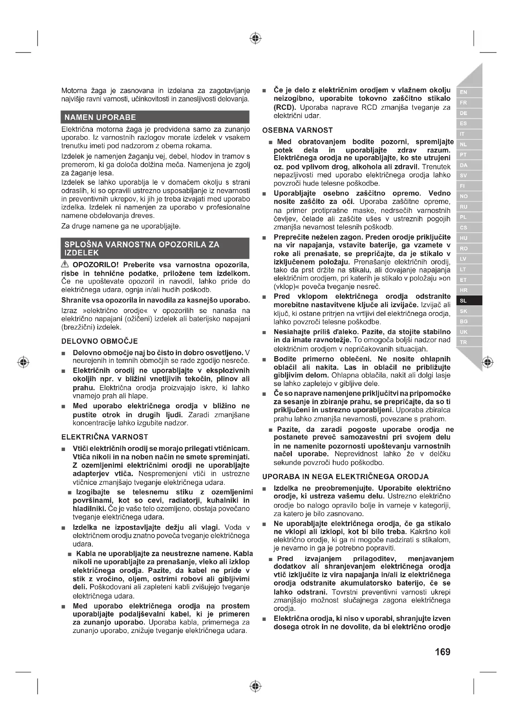 ■ Udeležite se strokovnega varnostnega usposabljanja glede uporabe, preventivnih ukrepov, prve pomoči in vzdrževanja verižnih žag. Prosimo, shranite ta navodila za kasnejšo rabo. ■ Verižne žage so nevarna orodja. Pri nesrečah z verižno žago si ljudje običajno odrežejo ude ali pa so nesreče celo smrtne. Smrtno nevarne so tudi padajoče veje in drevesa ter kotaleči se hlodi. Dodatno nevarnost predstavlja tudi oslabljeno ali nagnito drevo. Ocenite morate svoje zmožnosti za varno dokončanje dela. Če ste v dvomih, naj vam pomaga strokovnjak. ■ Največja moč napajanja lahko povzroči nihanja napetosti in vpliva na druge električne naprave, priključene v isto omrežje. Izdelek priključite na napajanje z impedanco 0,33 ali manj, da zmanjšate napetostna nihanja. Za podrobnejša navodila se obrnite na svojega dobavitelja električne energije. ■ Ne žagajte trte in/ali manjše podrasti (s premerom manj kot 75 mm). ■ Pred vsako uporabo preverite, če je napajalni kabel poškodovan. Če se napajalni kabel poškoduje, ga mora zamenjati usposobljena oseba v pooblaščenem servisnem centru, da se prepreči nevarnost. ■ Napajanje naprave mora imeti napravo za rezidualni tok (RCD), tok naj ne presega 30 mA. ■ Prepričajte se, da je napajalni kabel napeljan tako, da ga rezila ne morejo poškodovati in da nanj nič ali nihče ne more pasti, stopiti, se obenj spotakniti ali ga kakor koli poškodovati. ■ Priporočamo, da ob prvi uporabi izdelka polena žagate na kozi ali podobni opori. ■ Velikost delovnega območja je odvisna od izvajanega dela pa tudi od velikosti drevesa ali obdelovanca. Podiranje drevesa na primer zahteva večje delovno območje kot druga dela, kot je npr. krojenje ipd. Upravljavec mora biti pozoren na dogajanje v okolici in imeti nadzor nad njim. ■ Ne žagajte tako, da boste telo imeli vzporedno z mečem in verigo. To pomaga preprečiti stik verige z vašo glavo ali telesom v primeru povratnega udarca. ■ Ne izvajajte gibov žaganja naprej in nazaj. Pustite verigi, da opravi svoje delo. Veriga naj bo vedno ostra in ne poskušajte je potiskati skozi rez. ■ Ne pritiskajte na žago ob zaključku reza. Bodite pripravljeni, da boste lahko zadržali težo žage, ko prežagate skozi les. Neupoštevanje tega nasveta lahko povzroči hude telesne poškodbe. ■ Ne ustavljajte žage med žaganjem. Žaga naj obratuje, dokler je ne odstranite iz zareze. ■ Za zmanjšanje nevarnosti poškodb zaradi stika z premikajočimi se deli vedno zaustavite motor, uporabite zavoro verige in izklopite vtič iz napajalne vtičnice. Prepričajte se, da so se vsi premikajoči se deli popolnoma zaustavili: ● pred čiščenjem ali odstranjevanjem blokade ● preden zapustite napravo ● pred nameščanjem ali odstranjevanjem pripomočkov ● pred preverjanjem in vzdrževanjem izdelka ali delom na njem ■ Daljša uporaba orodja lahko privede do poškodb ali pa so poškodbe lahko hujše. Kadar orodje uporabljate dalj časa, si večkrat vzemite odmor. ■ Če izdelek pade, močno trči ali začne nenormalno vibrirati, ga nemudoma zaustavite in preverite, ali je poškodovan oziroma poiščite vzrok vibriranja. Vsakršno poškodbo mora ustrezno popraviti ali zamenjati pooblaščeni servisni center. ■ Izdelek uporabljajte samo pri temperaturah med 0 °C in 40 °C. ■ Izdelek shranjujte v prostoru, v katerem je temperatura okolja med -10°C in 50°C.