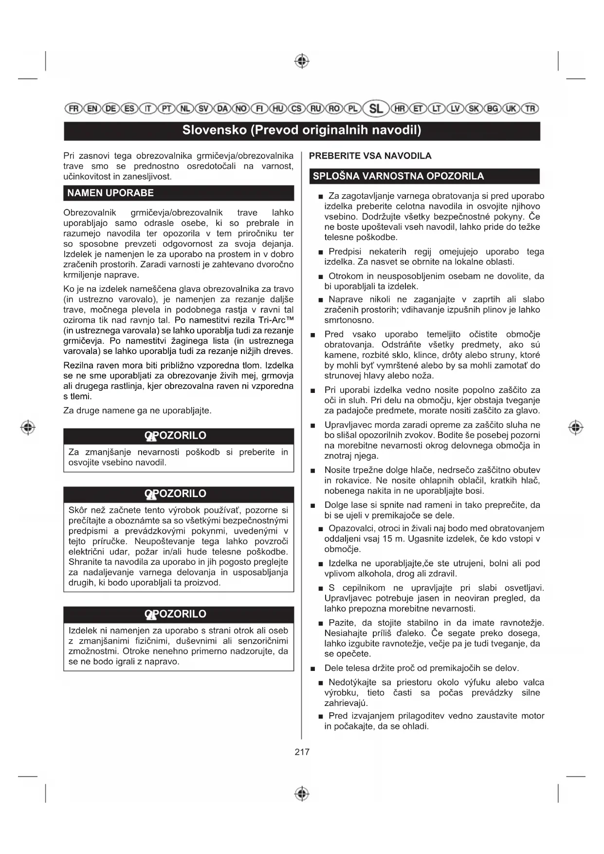 W tym silniku zastosowano świecę L8RTF/NHSP LD, L8RTF/BOSCH lub jej odpowiednik z przerwą iskrową 0,5 mm. Stosować ścisłe zamienniki. UWAGA Postarajcie się wprowadzić jak należy świecę zapłonową. Przekręcenie gwintu spowoduje poważne uszkodzenie silnika.217 Slovensko (Prevod originalnih navodil) Pri zasnovi tega obrezovalnika grmičevja/obrezovalnika trave smo se prednostno osredotočali na varnost, učinkovitost in zanesljivost. NAMEN UPORABE Obrezovalnik grmičevja/obrezovalnik trave lahko uporabljajo samo odrasle osebe, ki so prebrale in razumejo navodila ter opozorila v tem priročniku ter so sposobne prevzeti odgovornost za svoja dejanja. Izdelek je namenjen le za uporabo na prostem in v dobro zračenih prostorih. Zaradi varnosti je zahtevano dvoročno krmiljenje naprave. Ko je na izdelek nameščena glava obrezovalnika za travo (in ustrezno varovalo), je namenjen za rezanje daljše trave, močnega plevela in podobnega rastja v ravni tal oziroma tik nad ravnjo tal. Po namestitvi rezila Tri-Arc™ (in ustreznega varovala) se lahko uporablja tudi za rezanje grmičevja. Po namestitvi žaginega lista (in ustreznega varovala) se lahko uporablja tudi za rezanje nižjih dreves. Rezilna raven mora biti približno vzporedna tlom. Izdelka se ne sme uporabljati za obrezovanje živih mej, grmovja ali drugega rastlinja, kjer obrezovalna raven ni vzporedna s tlemi. Za druge namene ga ne uporabljajte. OPOZORILO Za zmanjšanje nevarnosti poškodb si preberite in osvojite vsebino navodil. OPOZORILO Skôr než začnete tento výrobok používať, pozorne si prečítajte a oboznámte sa so všetkými bezpečnostnými predpismi a prevádzkovými pokynmi, uvedenými v tejto príručke. Neupoštevanje tega lahko povzroči električni udar, požar in/ali hude telesne poškodbe. Shranite ta navodila za uporabo in jih pogosto preglejte za nadaljevanje varnega delovanja in usposabljanja drugih, ki bodo uporabljali ta proizvod. OPOZORILO Izdelek ni namenjen za uporabo s strani otrok ali oseb z zmanjšanimi fizičnimi, duševnimi ali senzoričnimi zmožnostmi. Otroke nenehno primerno nadzorujte, da se ne bodo igrali z napravo.