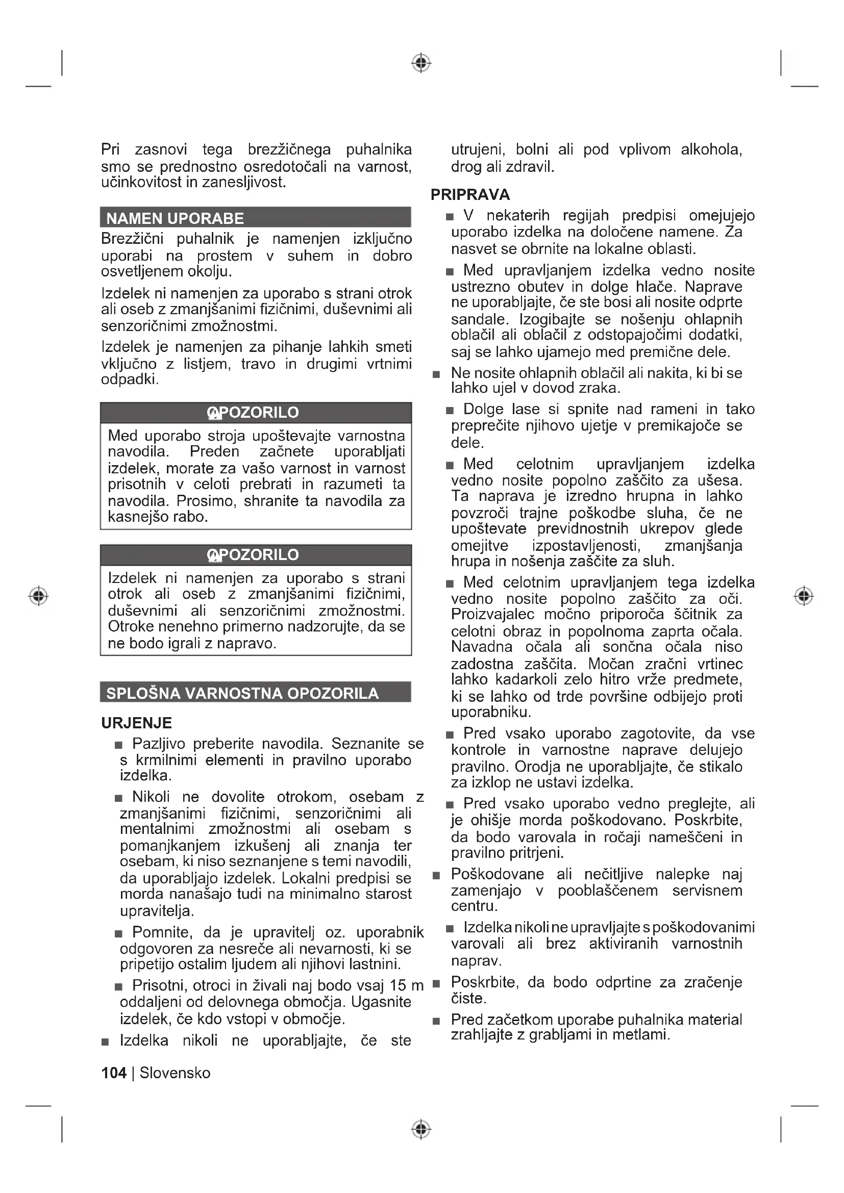 URJENJE ■ Pazljivo preberite navodila. Seznanite se s krmilnimi elementi in pravilno uporabo izdelka. ■ Nikoli ne dovolite otrokom, osebam z zmanjšanimi fizičnimi, senzoričnimi ali mentalnimi zmožnostmi ali osebam s pomanjkanjem izkušenj ali znanja ter osebam, ki niso seznanjene s temi navodili, da uporabljajo izdelek. Lokalni predpisi se morda nanašajo tudi na minimalno starost upravitelja. ■ Pomnite, da je upravitelj oz. uporabnik odgovoren za nesreče ali nevarnosti, ki se pripetijo ostalim ljudem ali njihovi lastnini. ■ Prisotni, otroci in živali naj bodo vsaj 15 m oddaljeni od delovnega območja. Ugasnite izdelek, če kdo vstopi v območje. ■ Izdelka nikoli ne uporabljajte, če ste utrujeni, bolni ali pod vplivom alkohola, drog ali zdravil. PRIPRAVA ■ V nekaterih regijah predpisi omejujejo uporabo izdelka na določene namene. Za nasvet se obrnite na lokalne oblasti. ■ Med upravljanjem izdelka vedno nosite ustrezno obutev in dolge hlače. Naprave ne uporabljajte, če ste bosi ali nosite odprte sandale. Izogibajte se nošenju ohlapnih oblačil ali oblačil z odstopajočimi dodatki, saj se lahko ujamejo med premične dele. ■ Ne nosite ohlapnih oblačil ali nakita, ki bi se lahko ujel v dovod zraka. ■ Dolge lase si spnite nad rameni in tako preprečite njihovo ujetje v premikajoče se dele. ■ Med celotnim upravljanjem izdelka vedno nosite popolno zaščito za ušesa. Ta naprava je izredno hrupna in lahko povzroči trajne poškodbe sluha, če ne upoštevate previdnostnih ukrepov glede omejitve izpostavljenosti, zmanjšanja hrupa in nošenja zaščite za sluh. ■ Med celotnim upravljanjem tega izdelka vedno nosite popolno zaščito za oči. Proizvajalec močno priporoča ščitnik za celotni obraz in popolnoma zaprta očala. Navadna očala ali sončna očala niso zadostna zaščita. Močan zračni vrtinec lahko kadarkoli zelo hitro vrže predmete, ki se lahko od trde površine odbijejo proti uporabniku. ■ Pred vsako uporabo zagotovite, da vse kontrole in varnostne naprave delujejo pravilno. Orodja ne uporabljajte, če stikalo za izklop ne ustavi izdelka. ■ Pred vsako uporabo vedno preglejte, ali je ohišje morda poškodovano. Poskrbite, da bodo varovala in ročaji nameščeni in pravilno pritrjeni. ■ Poškodovane ali nečitljive nalepke naj zamenjajo v pooblaščenem servisnem centru. ■ Izdelka nikoli ne upravljajte s poškodovanimi varovali ali brez aktiviranih varnostnih naprav. ■ Poskrbite, da bodo odprtine za zračenje čiste. ■ Pred začetkom uporabe puhalnika material zrahljajte z grabljami in metlami.105 Slovensko |