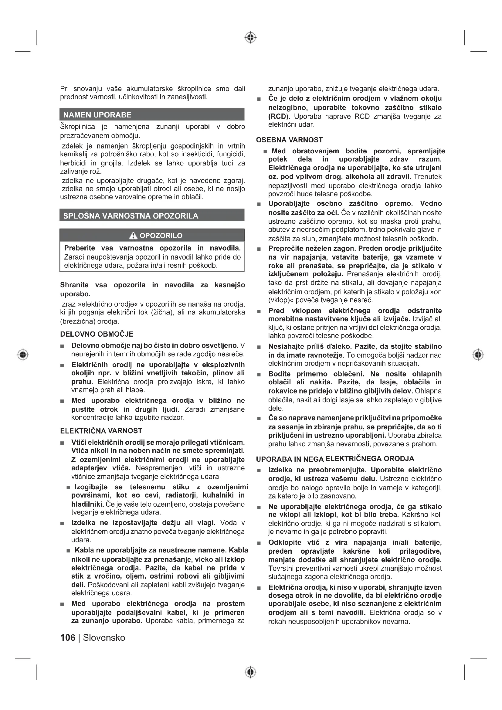 Zaustavite proizvod. Brava Otključavanje Dijelovi ili pribor prodan odvojeno Napomena Upozorenje106 | Slovensko Pri snovanju vaše akumulatorske škropilnice smo dali prednost varnosti, učinkovitosti in zanesljivosti. NAMEN UPORABE Škropilnica je namenjena zunanji uporabi v dobro prezračevanem območju. Izdelek je namenjen škropljenju gospodinjskih in vrtnih kemikalij za potrošniško rabo, kot so insekticidi, fungicidi, herbicidi in gnojila. Izdelek se lahko uporablja tudi za zalivanje rož. Izdelka ne uporabljajte drugače, kot je navedeno zgoraj. Izdelka ne smejo uporabljati otroci ali osebe, ki ne nosijo ustrezne osebne varovalne opreme in oblačil.