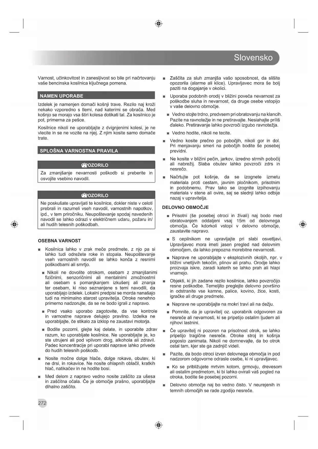 OPOZORILO Za zmanjšanje nevarnosti poškodb si preberite in osvojite vsebino navodil. OPOZORILO Ne poskušate upravljati te kosilnice, dokler niste v celoti prebrali in razumeli vseh navodil, varnostnih napotkov, ipd., v tem priročniku. Neupoštevanje spodaj navedenih navodil se lahko odrazi v električnem udaru, požaru in/ ali hudih telesnih poškodbah. OSEBNA VARNOST ■ Kosilnica lahko v zrak meče predmete, z njo pa si lahko tudi odrežete roke in stopala. Neupoštevanje vseh varnostnih navodil se lahko konča z resnimi poškodbami ali smrtjo. ■ Nikoli ne dovolite otrokom, osebam z zmanjšanimi fizičnimi, senzoričnimi ali mentalnimi zmožnostmi ali osebam s pomanjkanjem izkušenj ali znanja ter osebam, ki niso seznanjene s temi navodili, da uporabljajo izdelek. Lokalni predpisi se morda nanašajo tudi na minimalno starost upravitelja. Otroke nenehno primerno nadzorujte, da se ne bodo igrali z napravo. ■ Pred vsako uporabo zagotovite, da vse kontrole in varnostne naprave delujejo pravilno. Izdelka ne uporabljajte, če stikalo za izklop ne zaustavi motorja. ■ Bodite pozorni, glejte kaj delate, in uporabite zdrav razum, ko uporabljate kosilnice. Ne uporabljajte je, ko ste utrujeni ali pod vplivom drog, alkohola ali zdravil. Padec koncentracije pri uporabi naprave lahko privede do hudih telesnih poškodb. ■ Nosite močne dolge hlače, dolge rokave, obutev, ki ne drsi, in rokavice. Ne nosite ohlapnih oblačil, kratkih hlač, natikačev in ne hodite bosi. ■ Med delom z napravo vedno nosite zaščito za ušesa in zaščitna očala. Če je območje prašno, uporabljajte dihalno zaščito. ■ Zaščita za sluh zmanjša vašo sposobnost, da slišite opozorila (alarme ali klice). Upravljavec mora še bolj paziti na dogajanje v okolici. ■ Uporaba podobnih orodij v bližini poveča nevarnost za poškodbe sluha in nevarnost, da druge osebe vstopijo v vaše delovno območje. ■ Vedno stojte trdno, predvsem pri obratovanju na klancih. Pazite na ravnotežje in ne pretiravajte. Nesiahajte príliš ďaleko. Pretiravanje lahko povzroči izgubo ravnotežja. ■ Vedno hodite, nikoli ne tecite. ■ Vedno kosite prečno po pobočjih, nikoli gor in dol. Pri menjavanju smeri na pobočjih bodite še posebej previdni. ■ Ne kosite v bližini pečin, jarkov, izredno strmih pobočij ali nabrežij. Slaba obutev lahko povzroči zdrs in nesrečo. ■ Načrtujte pot košnje, da se izognete izmetu materiala proti cestam, javnim pločnikom, prisotnim in podobnemu. Prav tako se izognite izpihovanju materiala v stene ali ovire, saj se slednji lahko odbije nazaj v upravitelja.