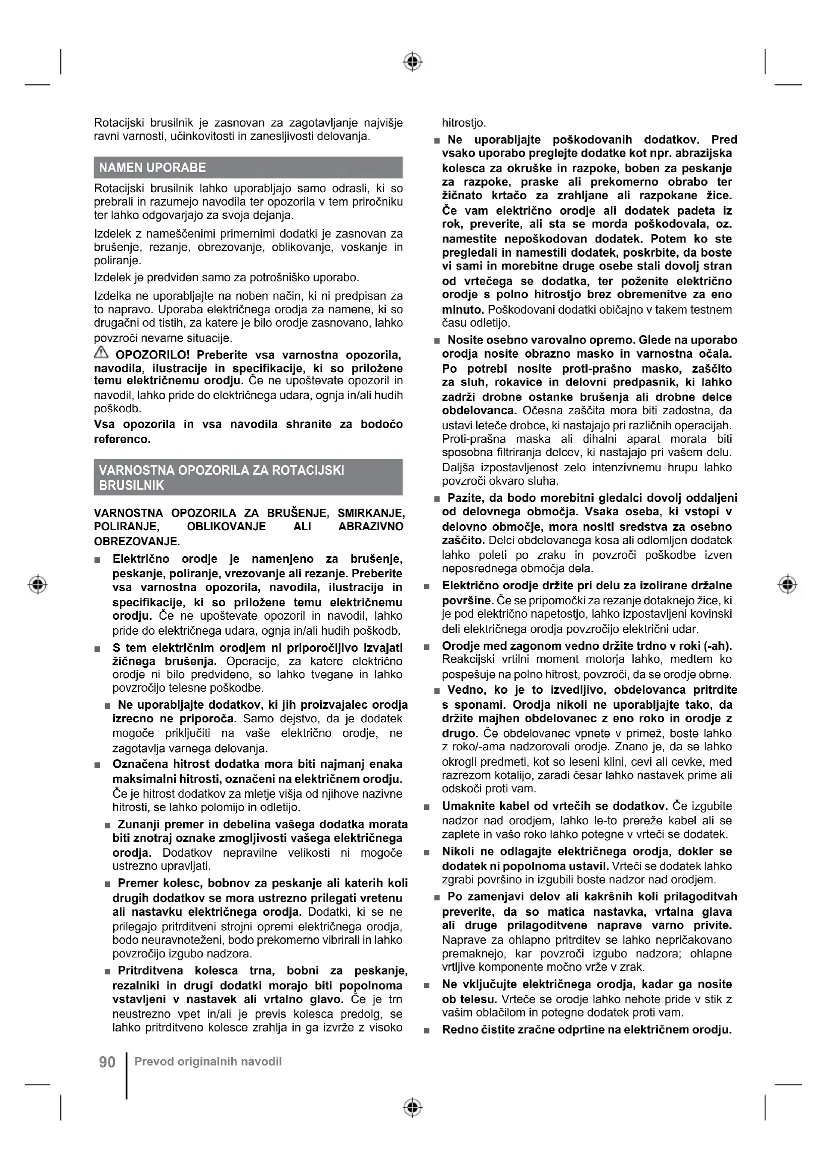 ELRotacijski brusilnik je zasnovan za zagotavljanje najvišje ravni varnosti, učinkovitosti in zanesljivosti delovanja. NAMEN UPORABE Rotacijski brusilnik lahko uporabljajo samo odrasli, ki so prebrali in razumejo navodila ter opozorila v tem priročniku ter lahko odgovarjajo za svoja dejanja. Izdelek z nameščenimi primernimi dodatki je zasnovan za brušenje, rezanje, obrezovanje, oblikovanje, voskanje in poliranje. Izdelek je predviden samo za potrošniško uporabo. Izdelka ne uporabljajte na noben način, ki ni predpisan za to napravo. Uporaba električnega orodja za namene, ki so drugačni od tistih, za katere je bilo orodje zasnovano, lahko povzroči nevarne situacije. OPOZORILO! Preberite vsa varnostna opozorila, navodila, ilustracije in specifikacije, ki so priložene temu električnemu orodju. Če ne upoštevate opozoril in navodil, lahko pride do električnega udara, ognja in/ali hudih poškodb. Vsa opozorila in vsa navodila shranite za bodočo referenco.