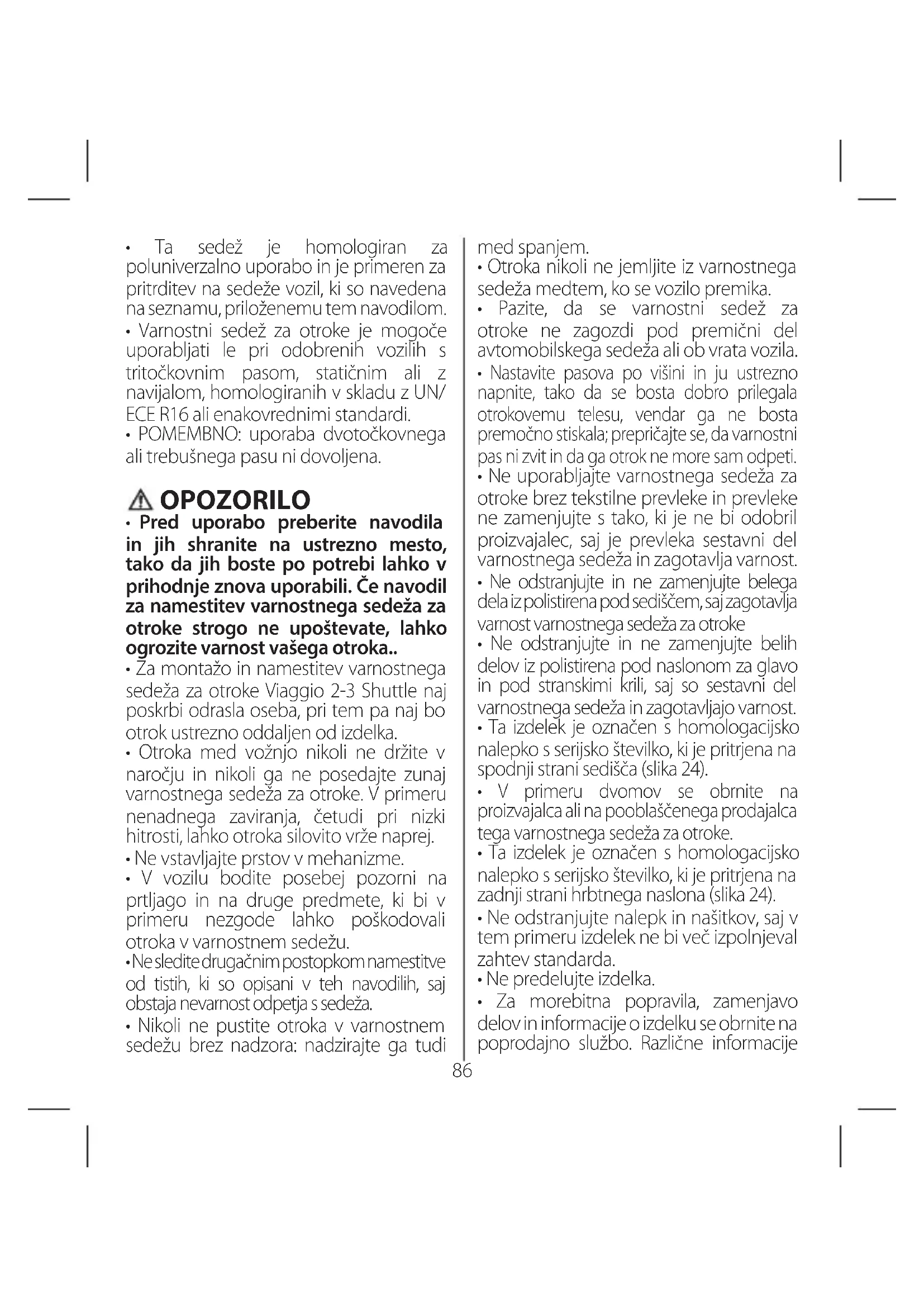 - Za montažo in namestitev varnostnega sedeža za otroke Viaggio 2-3 Shuttle naj poskrbi odrasla oseba, pri tem pa naj bo otrok ustrezno oddaljen od izdelka.