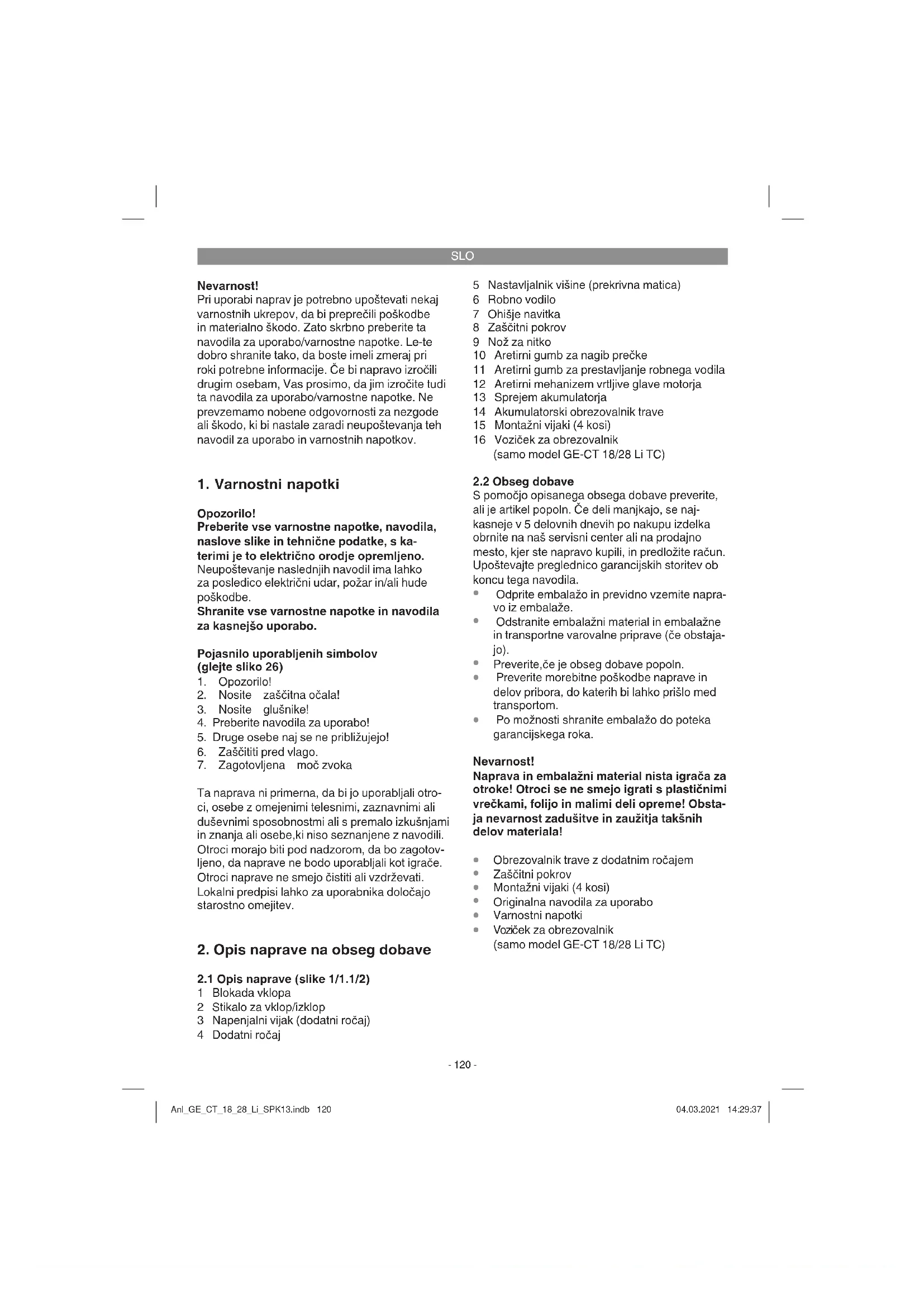 Teža ...................................... 3,0 kg / 5,8 kg (TC) Voziček za obrezovalnik (samo model GE-CT 18/28 Li TC) Nastavitev višine reza ... 35/55 mm; 2-stopenjska Pozor! Naprava je dobavljena brez akumulatorjev in pol- nilnika; uporabljate jo lahko samo z litij-ionskimi akumulatorji serije Power X-Change! Litij-ionske akumulatorje serije Power X-Change je dovoljeno polniti samo s polnilnikom Power X- Charger. Nivo hrupa pripomočka lahko prekorači 85 dB(A). V tem primeru mora uporabnik ustrezno ukrepati in se pred hrupom zaščititi. Hrup se meri v skladu z EN ISO 11201: 2010 in EN ISO 3744: 2010. Vrednost nihanj na ročaju je bila določena v skla- du z EN 28662-1: 1992. Navedena vrednost vibracij je bila določena po standardiziranem testnem postopku in se lahko porablja za medsebojno primerjavo različnih izdelkov. Poleg tega je ta vrednost primerna za predhodno oceno obremenitev za uporabnika, ki nastanejo zaradi vibracij. Previdno! Odvisno od uporabe naprave lahko dejanske vrednosti vibracij odstopajo od navedenih! Sprej- mite ukrepe za zaščito pred obremenitvami za- radi vibracij! Pri tem upoštevajte celoten delovni postopek, tudi trenutke, ko naprava deluje brez obremenitve ali je izklopljena! Primerni ukrepi med drugim vključujejo redno vzdrževanje in nego naprave ter nastavkov za orodja, ogrevanje rok, redne odmore in dobro načrtovanje delovnih postopkov! Omejite hrupnost in vibracije na minimum!