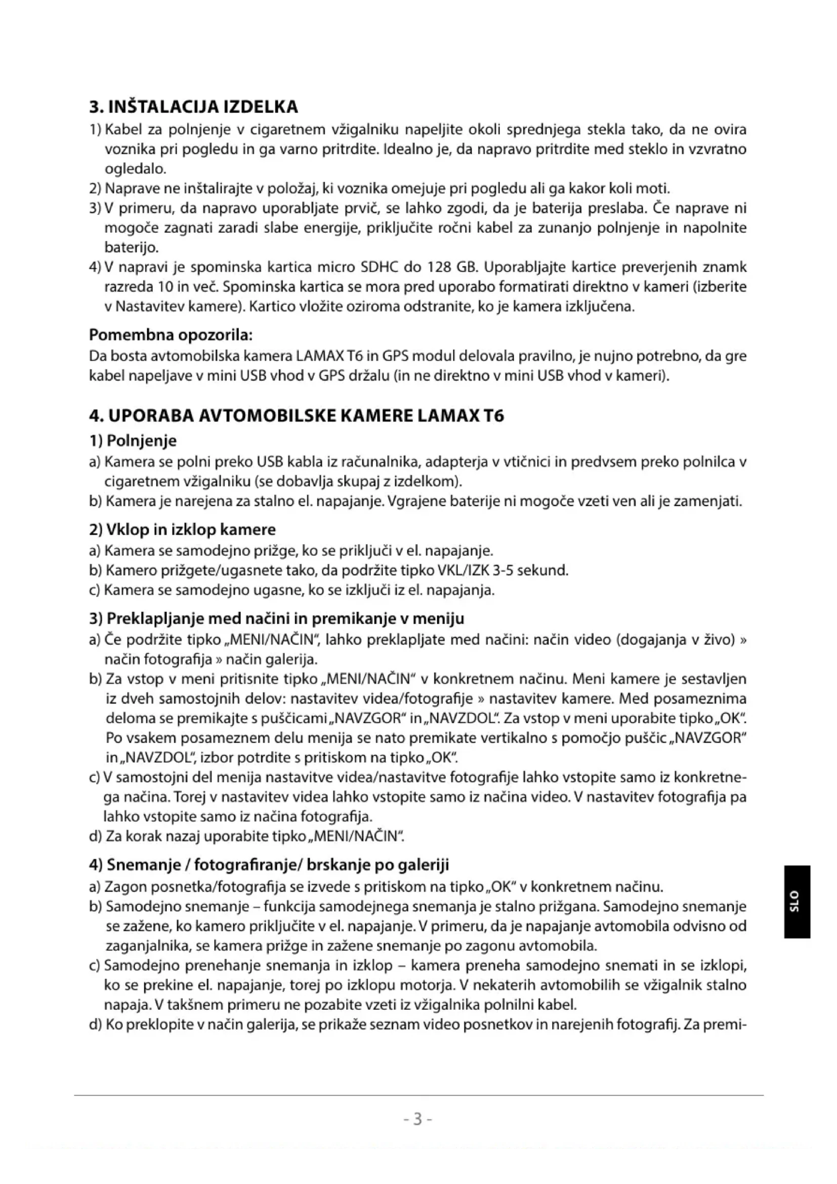 razreda 10 in več. Spominska kartica se mora pred uporabo formatirati direktno v kameri (izberite v Nastavitev kamere). Kartico vložite oziroma odstranite, ko je kamera izključena. Pomembna opozorila: Da bosta avtomobilska kamera LAMAX T6 in GPS modul delovala pravilno, je nujno potrebno, da gre kabel napeljave v mini USB vhod v GPS držalu (in ne direktno v mini USB vhod v kameri).