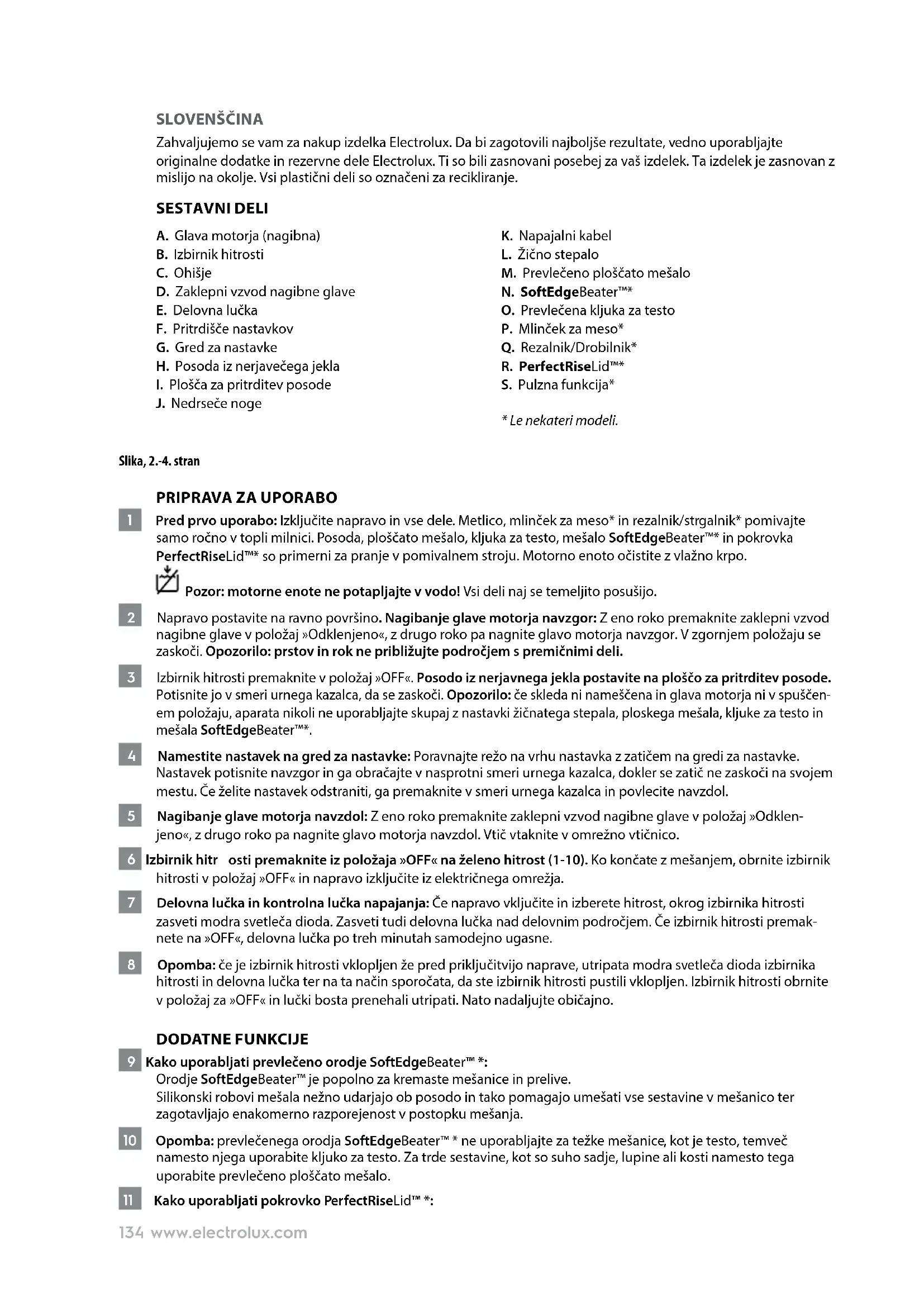 1 Pred prvo uporabo: Izključite napravo in vse dele. Metlico, mlinček za meso* in rezalnik/strgalnik* pomivajte samo ročno v topli milnici. Posoda, ploščato mešalo, kljuka za testo, mešalo SoftEdgeBeater™* in pokrovka PerfectRiseLid™* so pr imerni za pranje v pomivalnem stroju. Motorno enoto očistite z vlažno krpo. Pozor: motorne enote ne potapljajte v vodo! Vsi deli naj se temeljito posušijo. 2 Napravo postavite na ravno površino. Nagibanje glave motorja navzgor: Z eno roko premaknite zaklepni vzvod nagibne glave v položaj »Odklenjeno«, z drugo roko pa nagnite glavo motorja navzgor. V zgornjem položaju se zaskoči. Opozorilo: prstov in rok ne približujte področjem s premičnimi deli. 3 Izbirnik hitrosti premaknite v položaj »OFF«. Posodo iz nerjavnega jekla postavite na ploščo za pritrditev posode. Potisnite jo v smeri urnega kazalca, da se zaskoči. Opozorilo: če skleda ni nameščena in glava motorja ni v spuščen- em položaju, aparata nikoli ne uporabljajte skupaj z nastavki žičnatega stepala, ploskega mešala, kljuke za testo in mešala SoftEdgeBeater™*. 4 Namestite nastavek na gred za nastavke: Poravnajte režo na vrhu nastavka z zatičem na gredi za nastavke. Nastavek potisnite navzgor in ga obračajte v nasprotni smeri urnega kazalca, dokler se zatič ne zaskoči na svojem mestu. Če želite nastavek odstraniti, ga premaknite v smeri urnega kazalca in povlecite navzdol. 5 Nagibanje glave motorja navzdol: Z eno roko premaknite zaklepni vzvod nagibne glave v položaj »Odklen- jeno«, z drugo roko pa nagnite glavo motorja navzdol. Vtič vtaknite v omrežno vtičnico. 6 Izbirnik hitr osti premaknite iz položaja »OFF« na želeno hitrost (1-10). Ko končate z mešanjem, obrnite izbirnik hitrosti v položaj »OFF« in napravo izključite iz električnega omrežja. 7 Delovna lučka in kontrolna lučka napajanja: Če napravo vključite in izberete hitrost, okrog izbirnika hitrosti zasveti modra svetleča dioda. Zasveti tudi delovna lučka nad delovnim področjem. Če izbirnik hitrosti premak- nete na »OFF«, delovna lučka po treh minutah samodejno ugasne. 8 Opomba: če je izbirnik hitrosti vklopljen že pred priključitvijo naprave, utripata modra svetleča dioda izbirnika hitrosti in delovna lučka ter na ta način sporočata, da ste izbirnik hitrosti pustili vklopljen. Izbirnik hitrosti obrnite v položaj za »OFF« in lučki bosta prenehali utripati. Nato nadaljujte običajno. DODATNE FUNKCIJE 9 Kako uporabljati prevlečeno orodje SoftEdgeBeater™ *: Orodje SoftEdgeBeater™ je popolno za kremaste mešanice in prelive. Silikonski robovi mešala nežno udarjajo ob posodo in tako pomagajo umešati vse sestavine v mešanico ter zagotavljajo enakomerno razporejenost v postopku mešanja. 10 Opomba: prevlečenega orodja SoftEdgeBeater™ * ne uporabljajte za težke mešanice, kot je testo, temveč namesto njega uporabite kljuko za testo. Za trde sestavine, kot so suho sadje, lupine ali kosti namesto tega uporabite prevlečeno ploščato mešalo