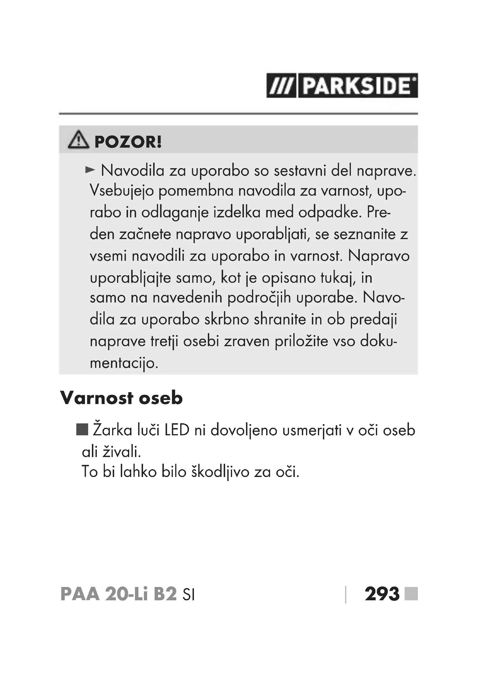 293 ■ POZOR! ► Navodila za uporabo so sestavni del naprave. Vsebujejo pomembna navodila za varnost, upo- rabo in odlaganje izdelka med odpadke. Pre- den začnete napravo uporabljati, se seznanite z vsemi navodili za uporabo in varnost. Napravo uporabljajte samo, kot je opisano tukaj, in samo na navedenih področjih uporabe. Navo- dila za uporabo skrbno shranite in ob predaji naprave tretji osebi zraven priložite vso doku- mentacijo. Varnost oseb ■ Žarka luči LED ni dovoljeno usmerjati v oči oseb ali živali. To bi lahko bilo škodljivo za oči.PAA 20-Li B2■ 294