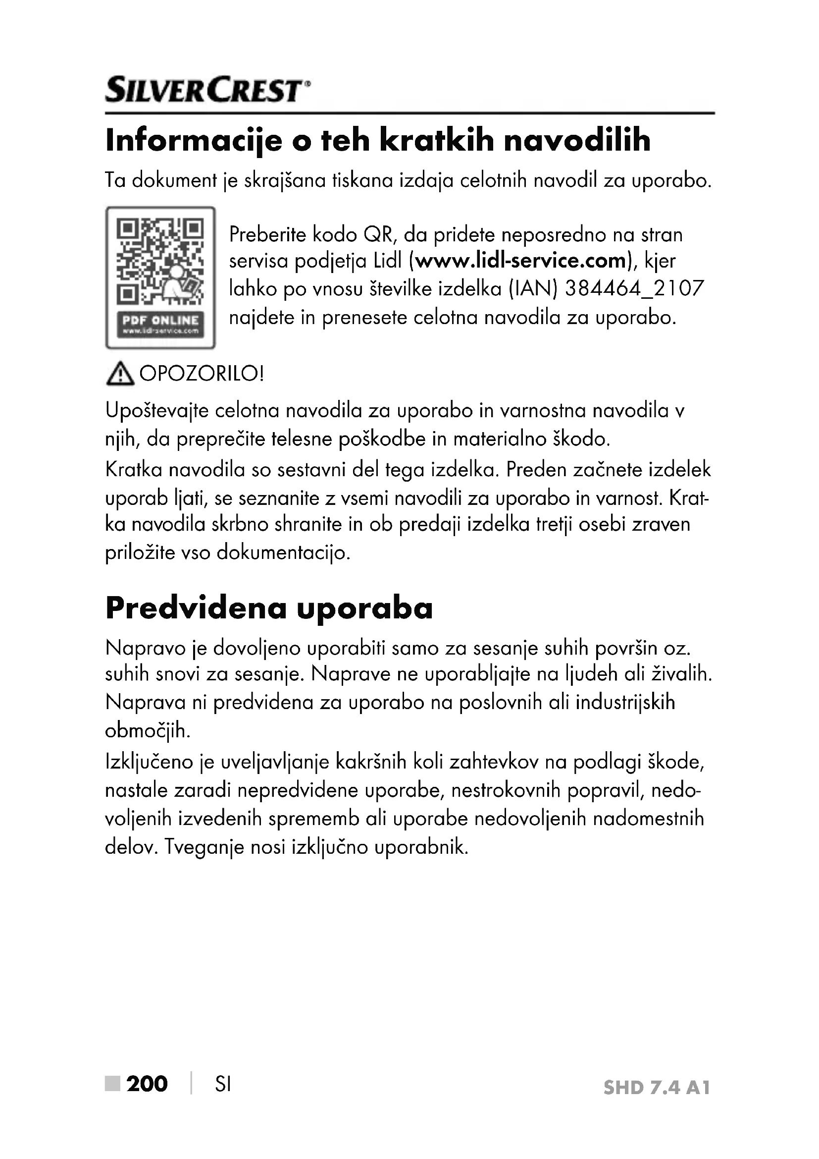 SI Informacije o teh kratkih navodilih Ta dokument je skrajšana tiskana izdaja celotnih navodil za uporabo. Preberite kodo QR, da pridete neposredno na stran servisa podjetja Lidl (www.lidl-service.com), kjer lahko po vnosu številke izdelka (IAN) 384464_2107 najdete in prenesete celotna navodila za uporabo. OPOZORILO! Upoštevajte celotna navodila za uporabo in varnostna navodila v njih, da preprečite telesne poškodbe in materialno škodo. Kratka navodila so sestavni del tega izdelka. Preden začnete izdelek uporab ljati, se seznanite z vsemi navodili za uporabo in varnost. Krat- ka navodila skrbno shranite in ob predaji izdelka tretji osebi zraven priložite vso dokumentacijo. Predvidena uporaba Napravo je dovoljeno uporabiti samo za sesanje suhih površin oz. suhih snovi za sesanje. Naprave ne uporabljajte na ljudeh ali živalih. Naprava ni predvidena za uporabo na poslovnih ali industrijskih območjih. Izključeno je uveljavljanje kakršnih koli zahtevkov na podlagi škode, nastale zaradi nepredvidene uporabe, nestrokovnih popravil, nedo- voljenih izvedenih sprememb ali uporabe nedovoljenih nadomestnih delov. Tveganje nosi izključno uporabnik.SHD 7.4 A1 SI
