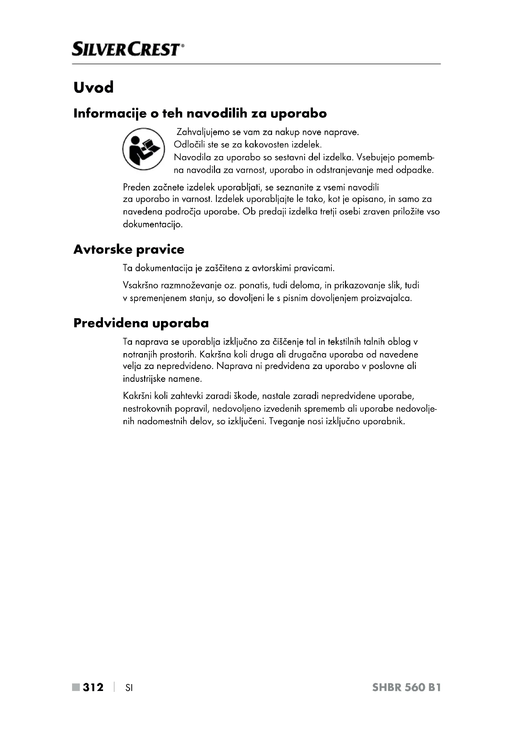 SI SHBR 560 B1 Uvod Informacije o teh navodilih za uporabo Zahvaljujemo se vam za nakup nove naprave. Odločili ste se za kakovosten izdelek. Navodila za uporabo so sestavni del izdelka. Vsebujejo pomemb- na navodila za varnost, uporabo in odstranjevanje med odpadke. Preden začnete izdelek uporabljati, se seznanite z vsemi navodili za uporabo in varnost. Izdelek uporabljajte le tako, kot je opisano, in samo za navedena področja uporabe. Ob predaji izdelka tretji osebi zraven priložite vso dokumentacijo. Avtorske pravice Ta dokumentacija je zaščitena z avtorskimi pravicami. Vsakršno razmnoževanje oz. ponatis, tudi deloma, in prikazovanje slik, tudi v spremenjenem stanju, so dovoljeni le s pisnim dovoljenjem proizvajalca. Predvidena uporaba Ta naprava se uporablja izključno za čiščenje tal in tekstilnih talnih oblog v notranjih prostorih. Kakršna koli druga ali drugačna uporaba od navedene velja za nepredvideno. Naprava ni predvidena za uporabo v poslovne ali industrijske namene. Kakršni koli zahtevki zaradi škode, nastale zaradi nepredvidene uporabe, nestrokovnih popravil, nedovoljeno izvedenih sprememb ali uporabe nedovolje- nih nadomestnih delov, so izključeni. Tveganje nosi izključno uporabnik.SI