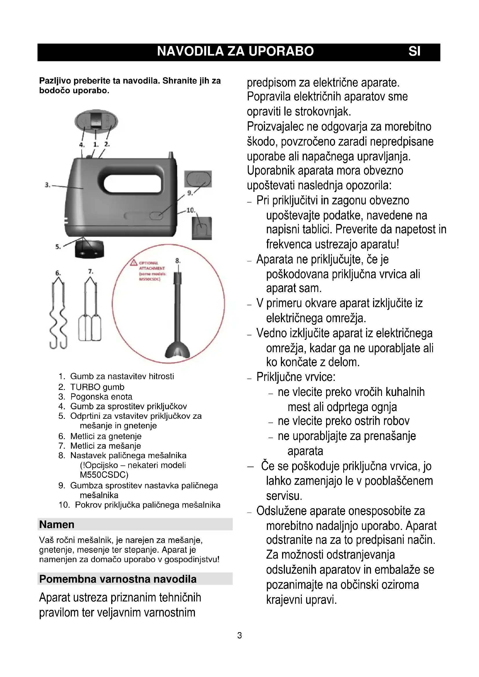 - Močno držite posodo, ko mešate v njej. Kako namestiti / odstraniti palični mešalnik: Opcijsko – nekateri modeli M550CSDC Odprite pokrov priključka paličnega mešalnika (10) in nato v ročni mešalnik vstavite nastavek paličnega mešalnika. Če je palica paličnega mešalnika pravilno nameščena, se sliši zvok "klik". Opozorilo: Rezilo je zelo ostro! Ravnajte previdno! Če želite odstraniti palico mešalnika, najprej pritisnite gumb (9), nato izvlecite palico paličnega mešalnika. Čiščenje in vzdrževanje Pred čiščenjem, vedno izvlecite vtič iz omrežne vtičnice! Mešalnik obrišite z vlažno krpo. Ne potapljajte ga v vodo in ne čistite ga pod tekočo vodo! Ne uporabljajte grobih čistil. Priključke mešalnika lahko umijete z krpo in neagresivnimi čistilnimi sredstvi. Aparat ne zahteva posebnega vzdrževanja. OKOLJE Aparata po preteku življenjske dobe ne zavrzite skupaj z običajnimi gospodinjskimi odpadki, temveč ga odložite na uradnem zbirnem mestu za recikliranje. Tako pripomorete k ohranitvi okolja.