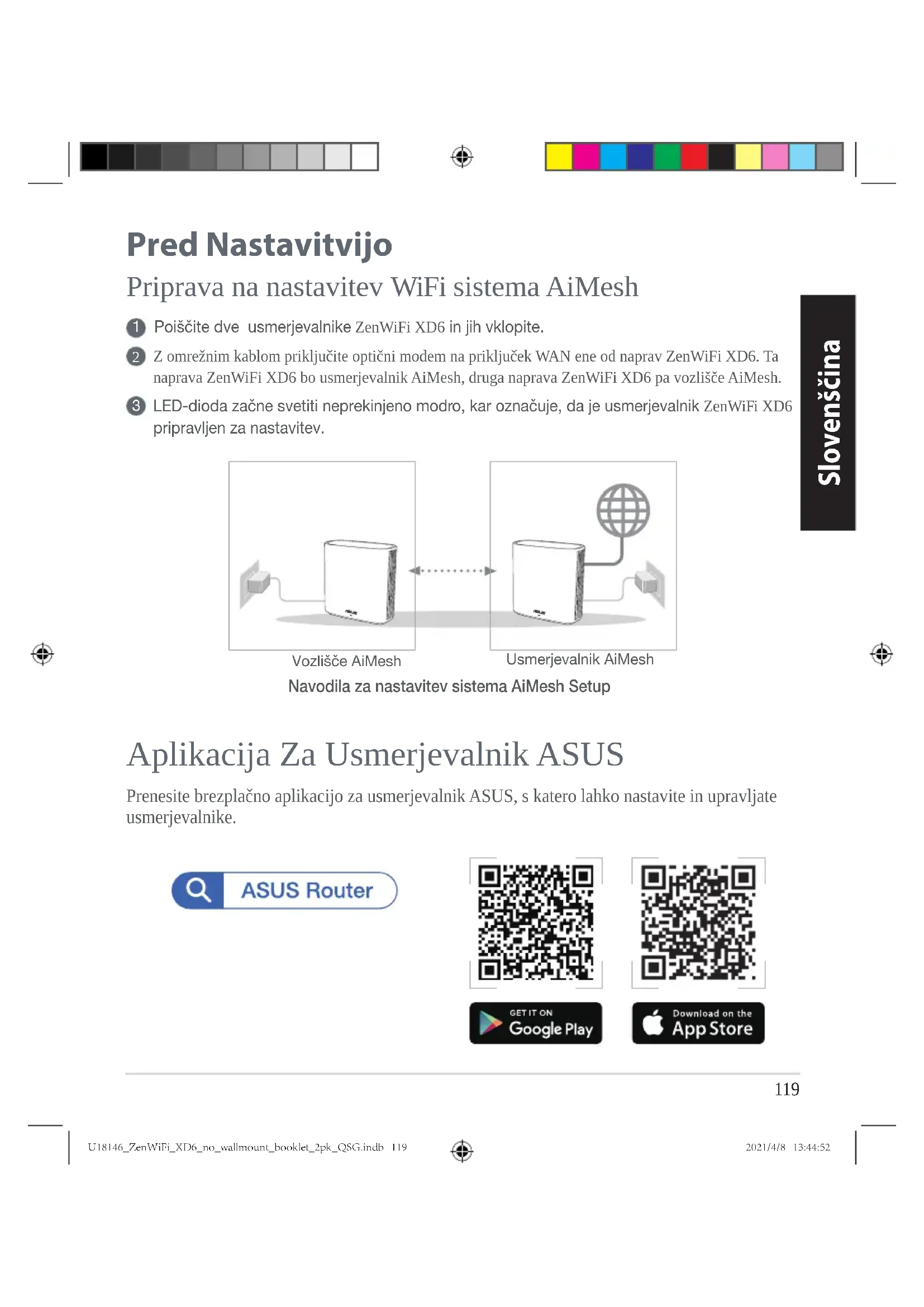 OPOMBE: Usmerjevalniki ne smejo biti v bližini naprav, kot so brezžični telefoni, naprave Bluetooth in mikrovalovne pečice, da čim bolj zmanjšate motnje. Priporočamo, da usmerjevalnike postavite na odprto in prostorno mesto. LED-indikatorji naprave ZenWiFi XD6 Sveti neprekinjeno modro: Usmerjevalnik ZenWiFi XD6 je pripravljen za nastavitev. Sveti neprekinjeno belo: Usmerjevalnik ZenWiFi XD6 ima vzpostavljeno povezavo s spletom in deluje pravilno. Sveti neprekinjeno rumeno: Signal med usmerjevalnikom ZenWiFi XD6 in vozliščem je šibek. Sveti neprekinjeno rdeče: Usmerjevalnik ZenWiFi XD6 nima vzpostavljene povezave z internetom. /Vaše vozlišče nima vzpostavljene povezave z usmerjevalnikom. U18146_ZenWiFi_XD6_no_wallmount_booklet_2pk_QSG.indb 121U18146_ZenWiFi_XD6_no_wallmount_booklet_2pk_QSG.indb 121 2021/4/8 13:44:522021/4/8 13:44:52122 Slovenščina Pogosta vprašanja Pogosta vprašanja
