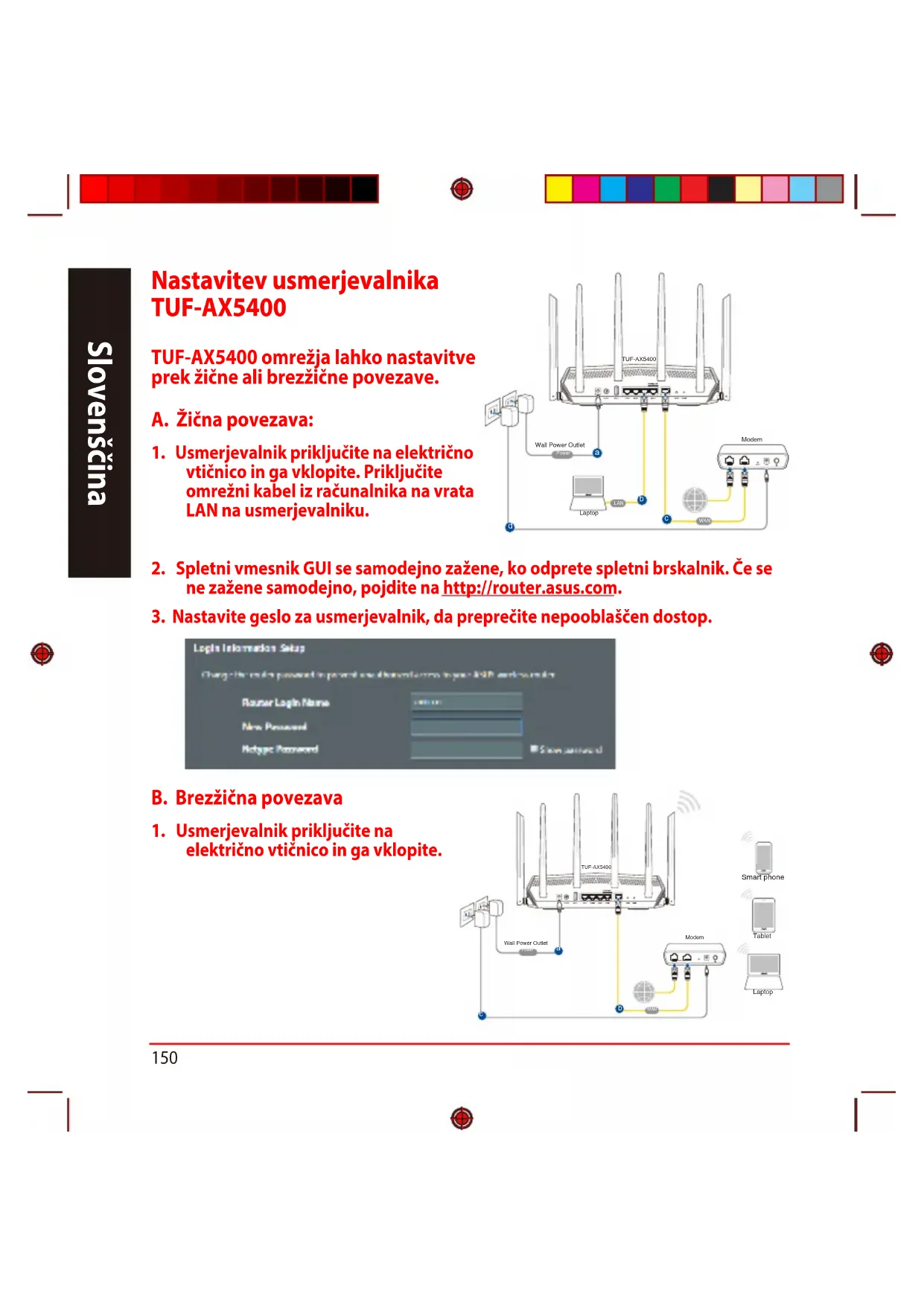 Slovenščina Nastavitev usmerjevalnika Nastavitev usmerjevalnika TUF-AX5400 TUF-AX5400 TUF-AX5400 omrežja lahko nastavitve prek žične ali brezžične povezave. A. Žična povezava: